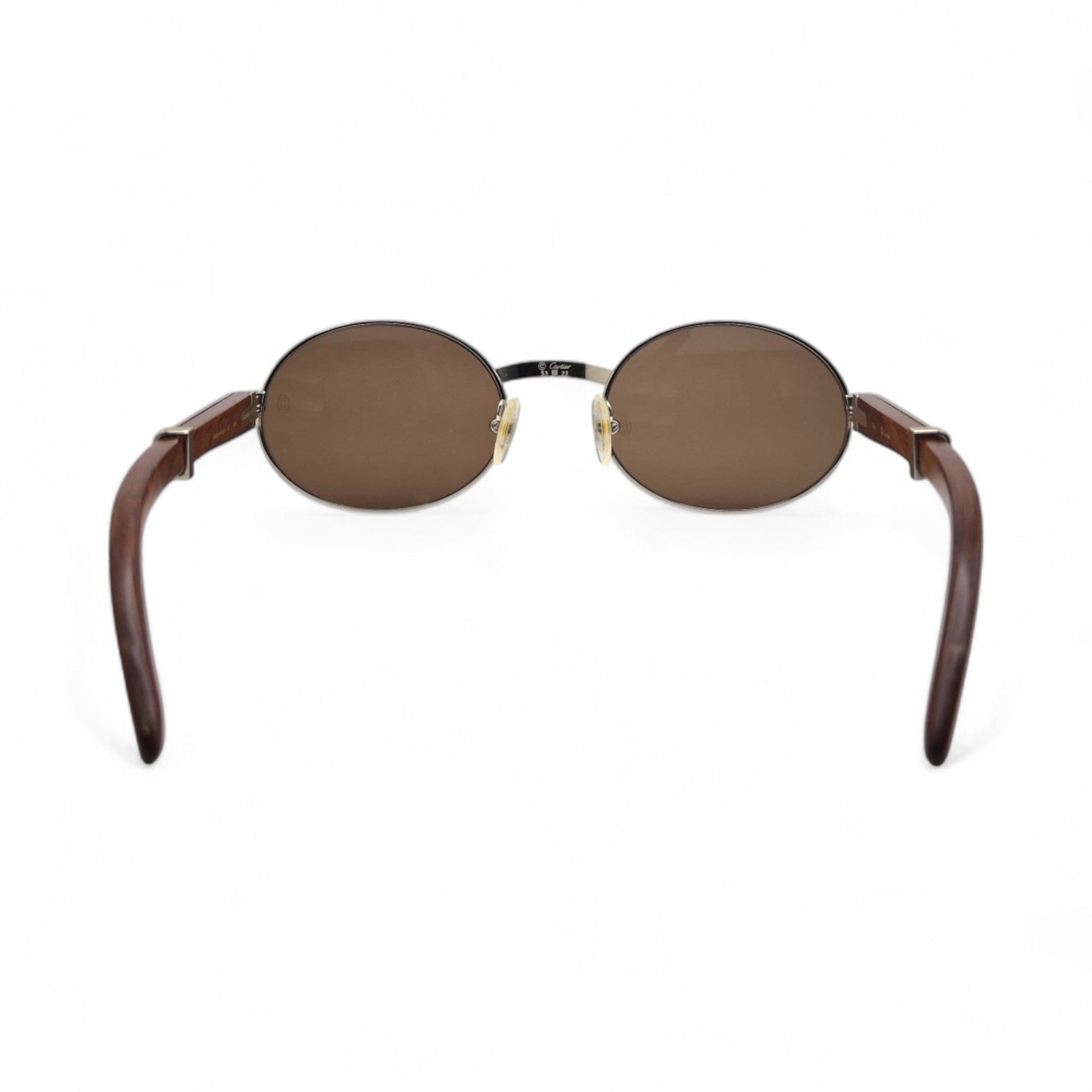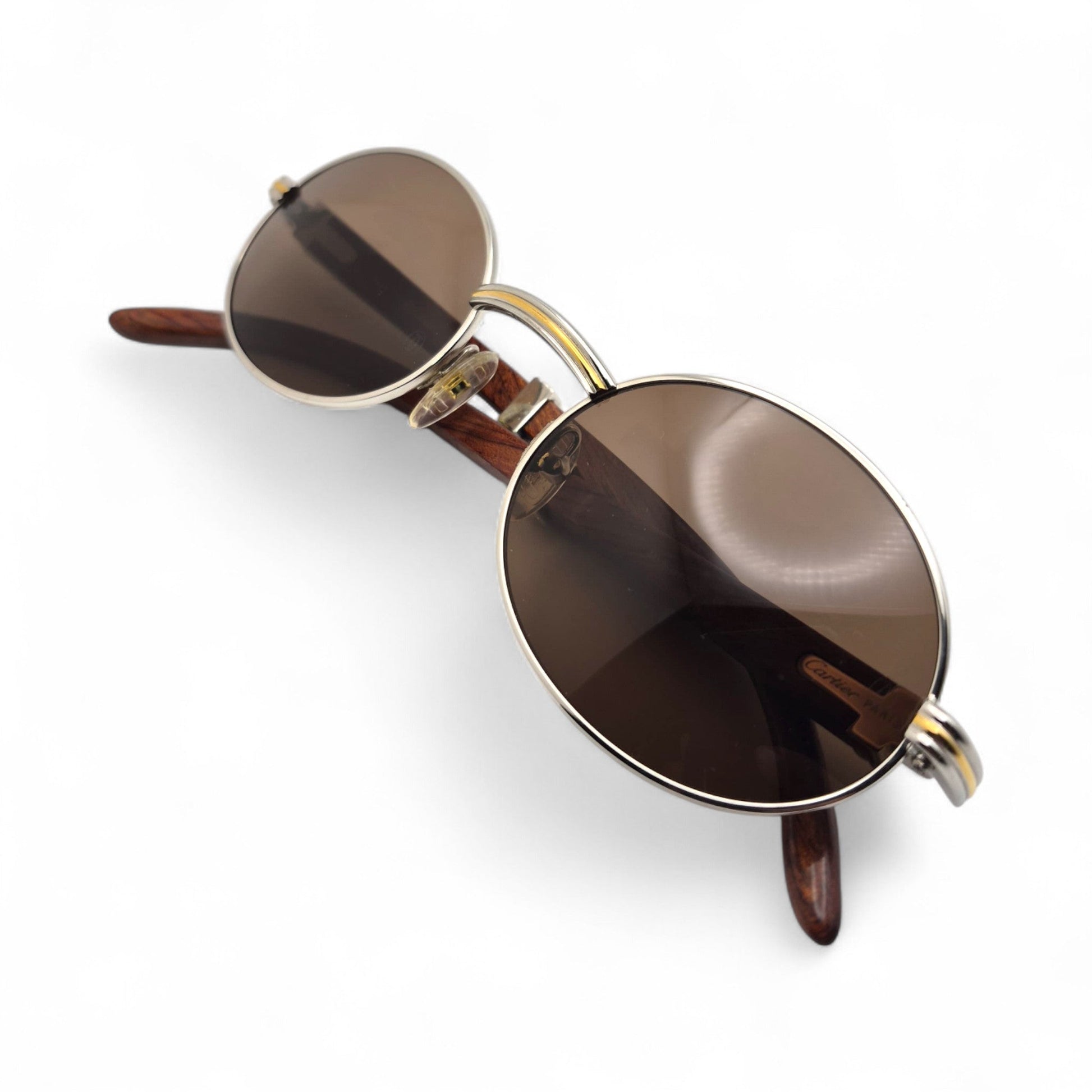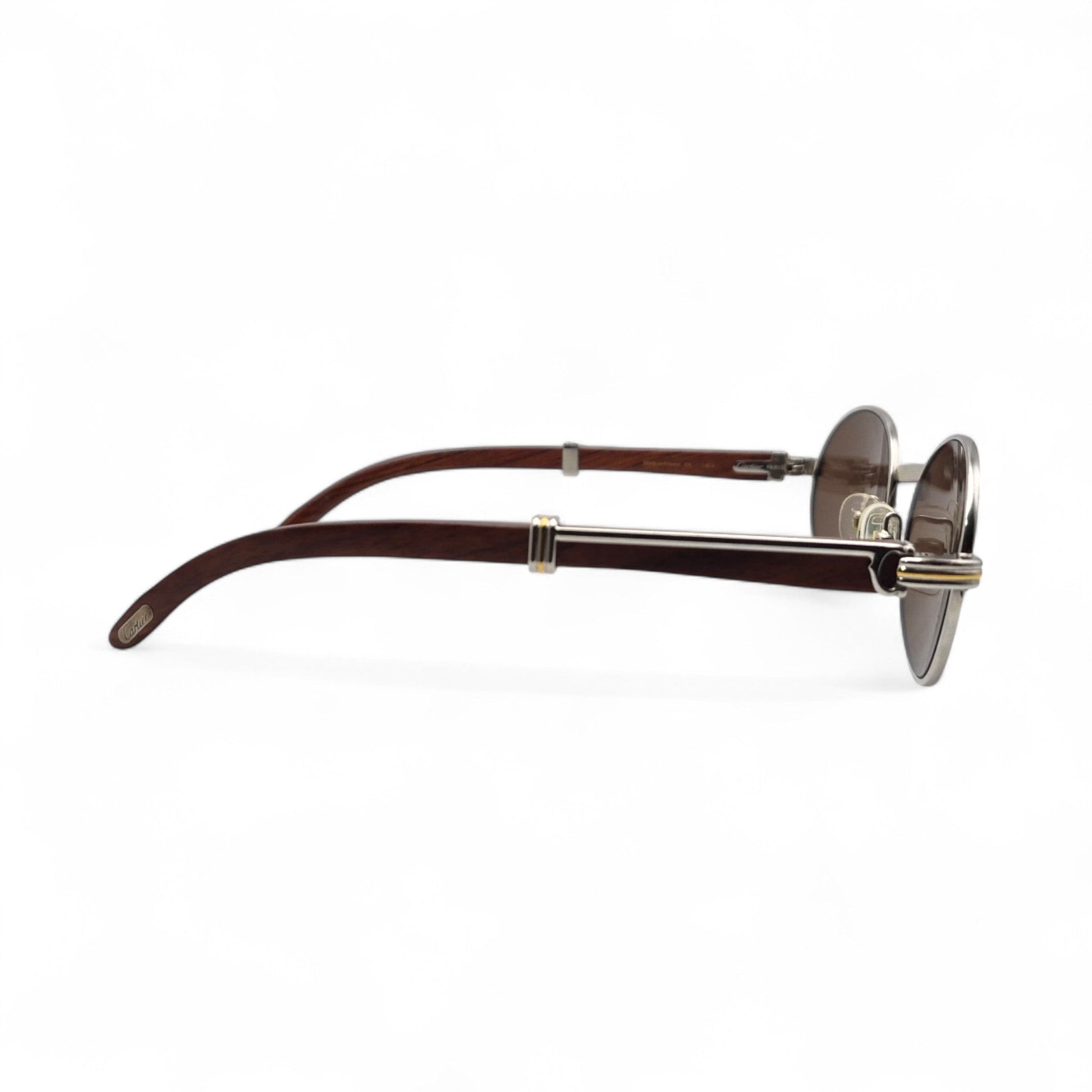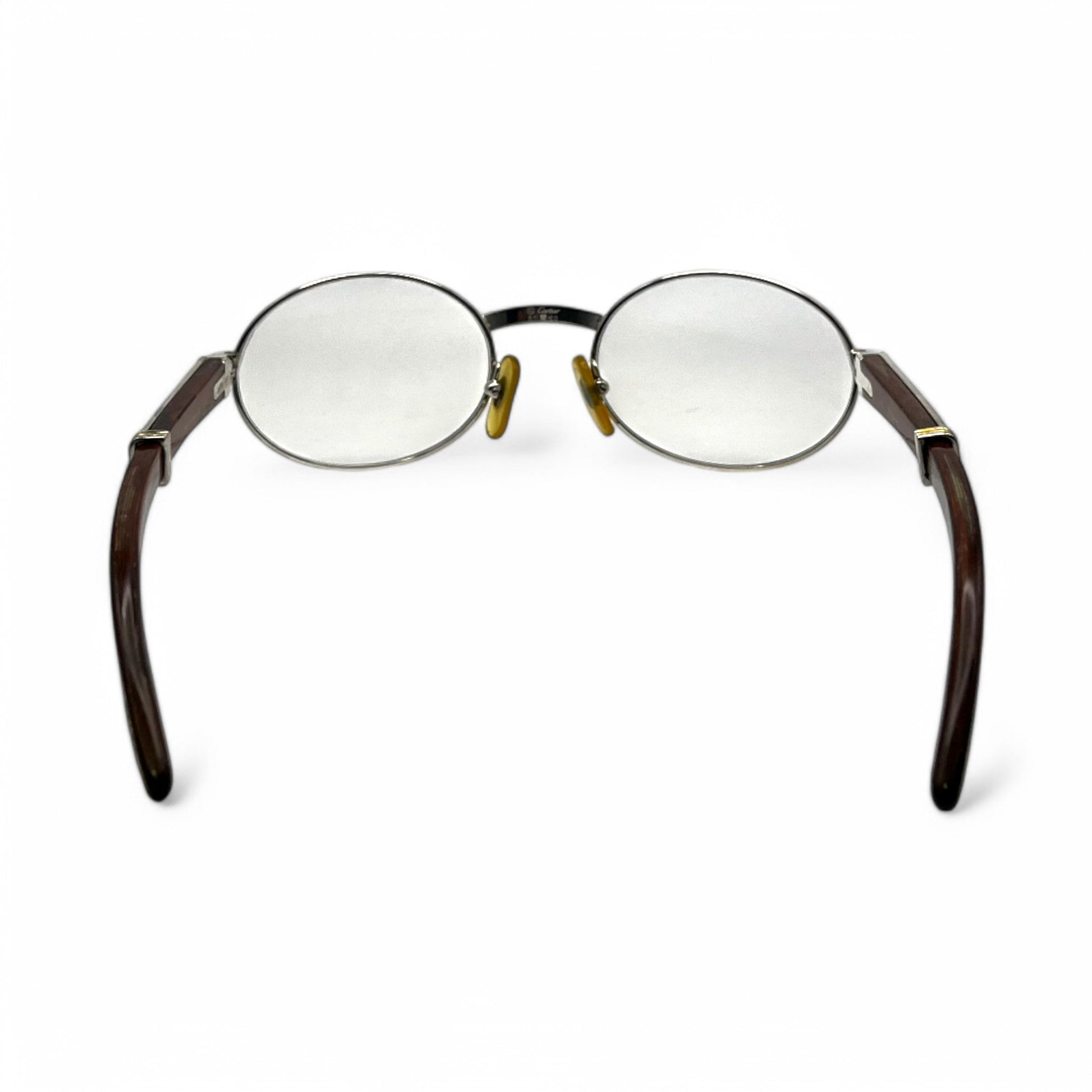 This Cartier Giverny authentic sunglasses are a representative style from the 90s, they come in this presentation with a silver full frame, dark wood temples and transitional oval lenses.