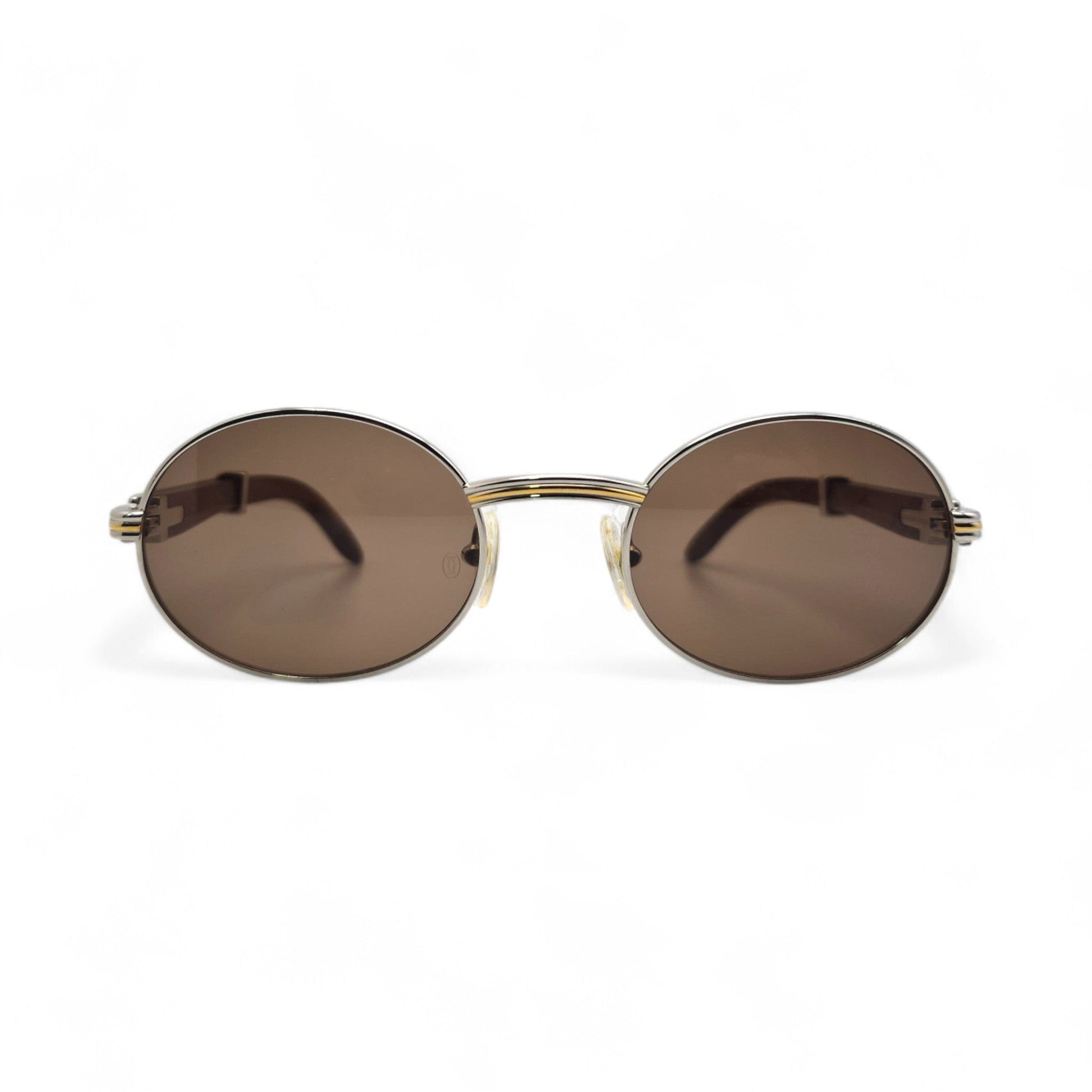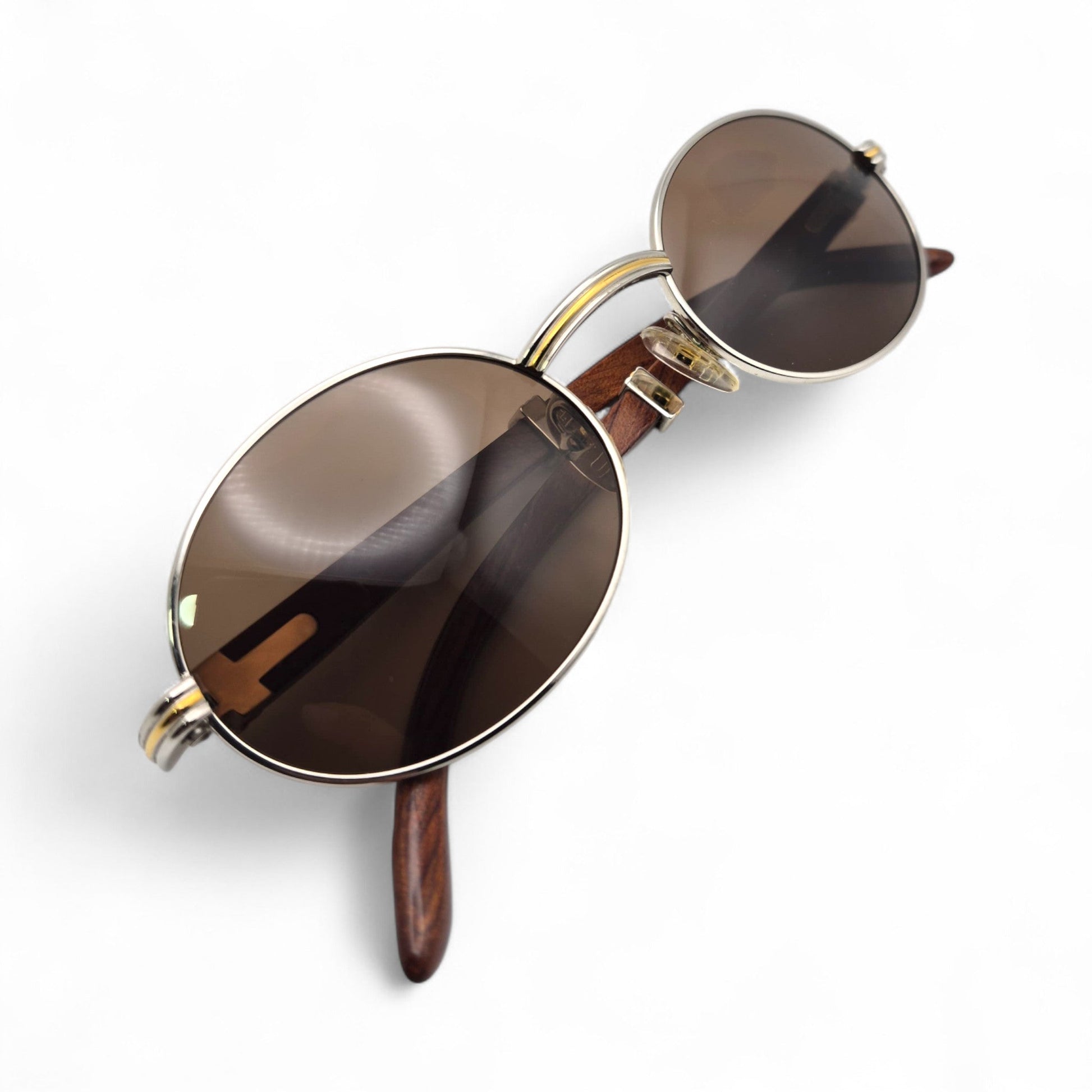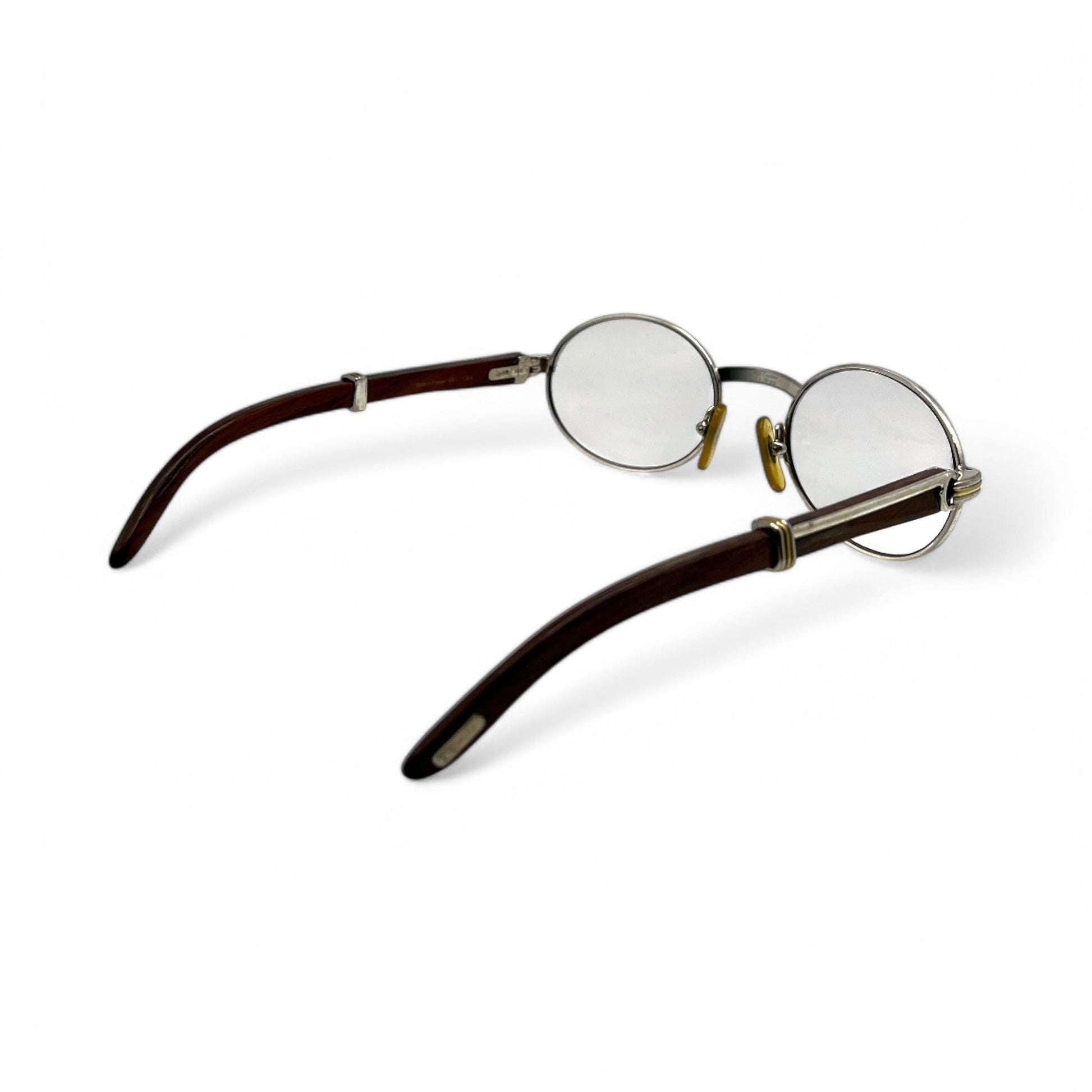 This Cartier Giverny authentic sunglasses are a representative style from the 90s, they come in this presentation with a silver full frame, dark wood temples and transitional oval lenses.