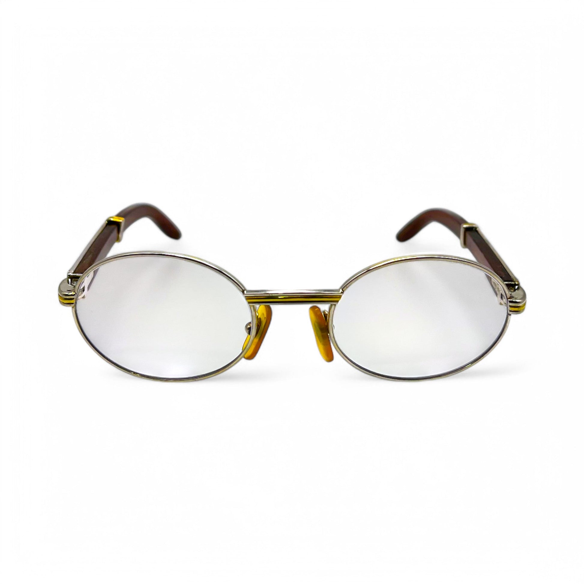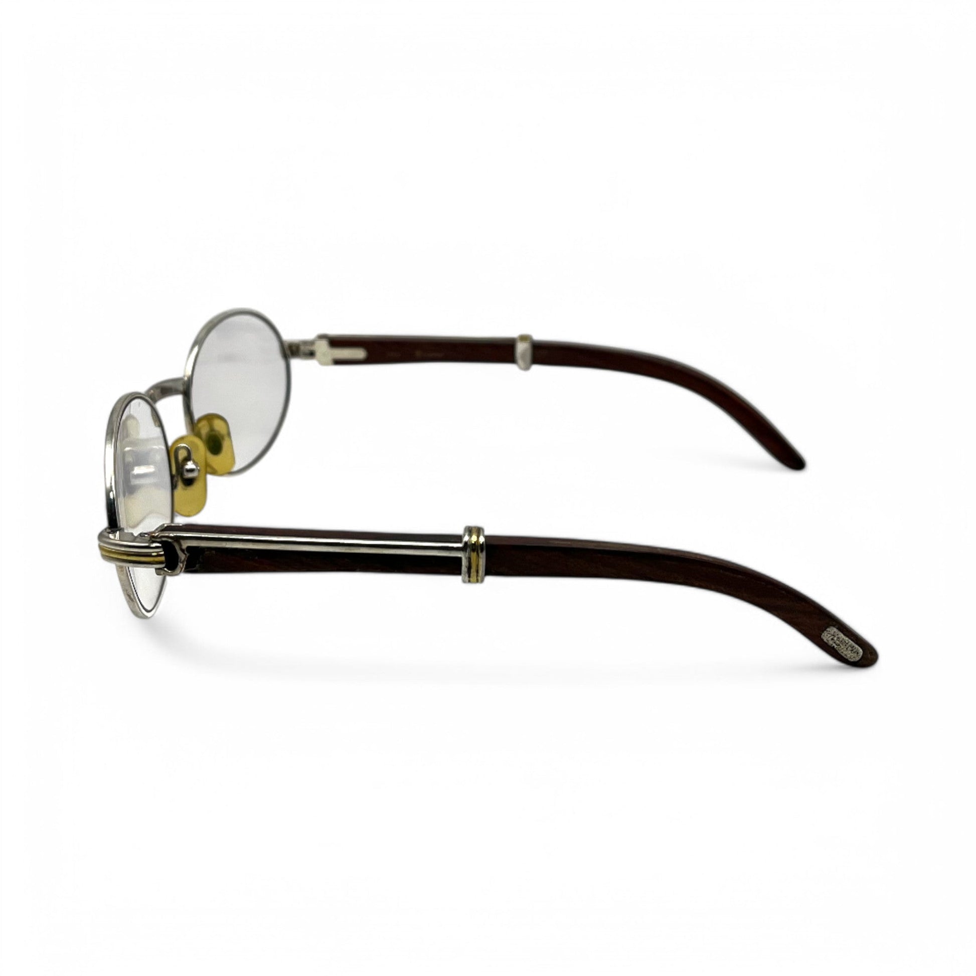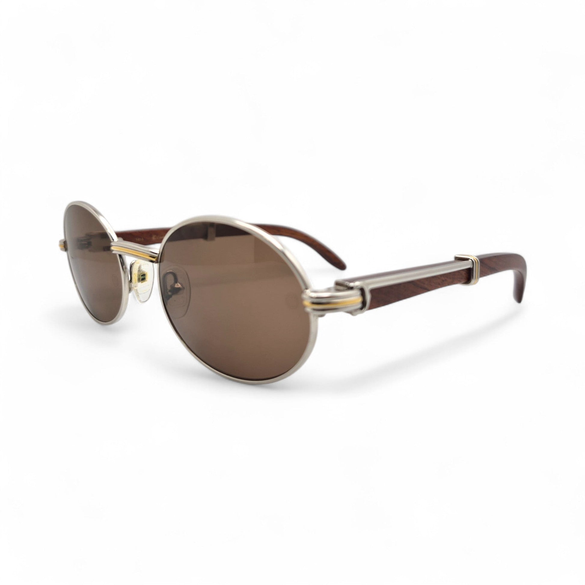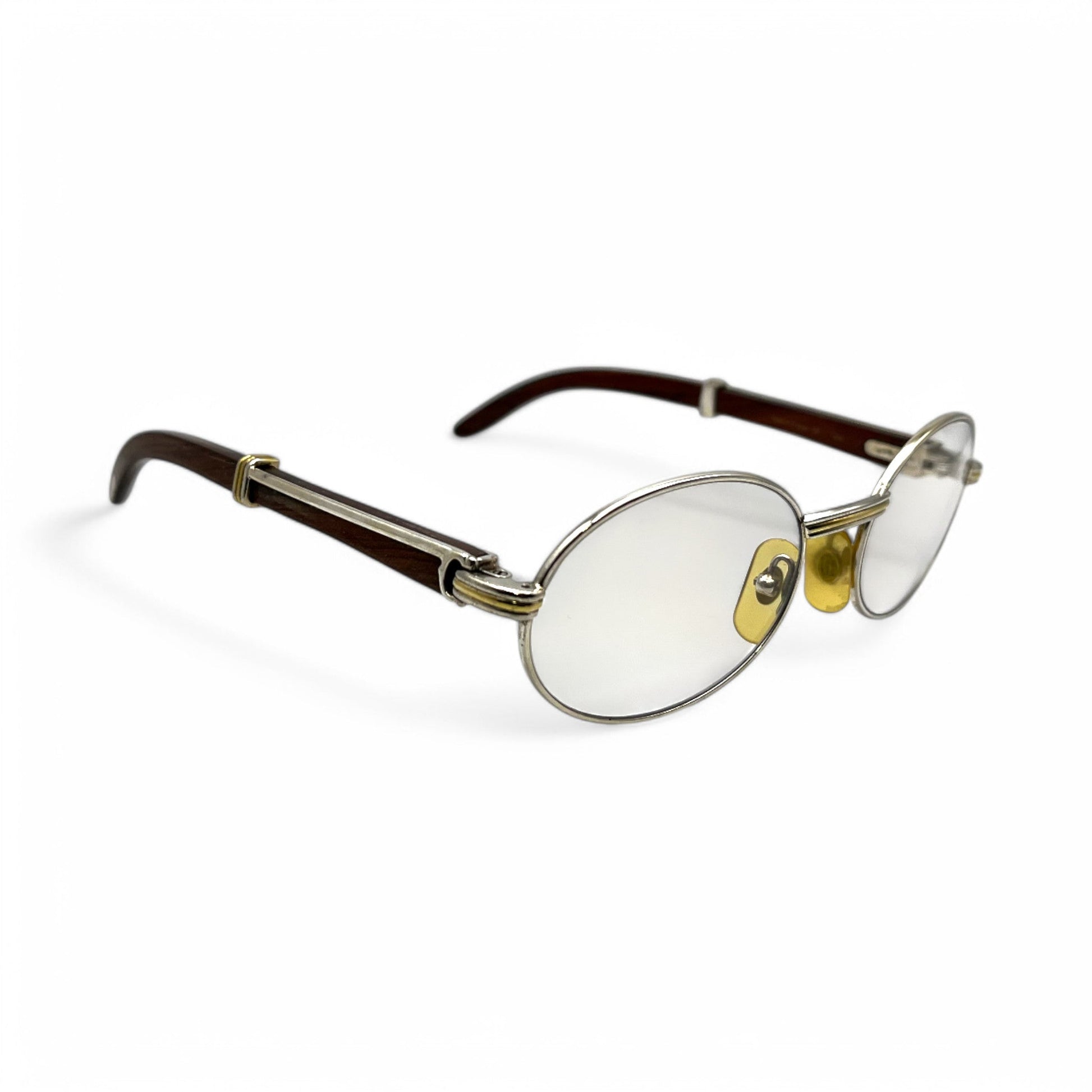 This Cartier Giverny authentic sunglasses are a representative style from the 90s, they come in this presentation with a silver full frame, dark wood temples and transitional oval lenses.
