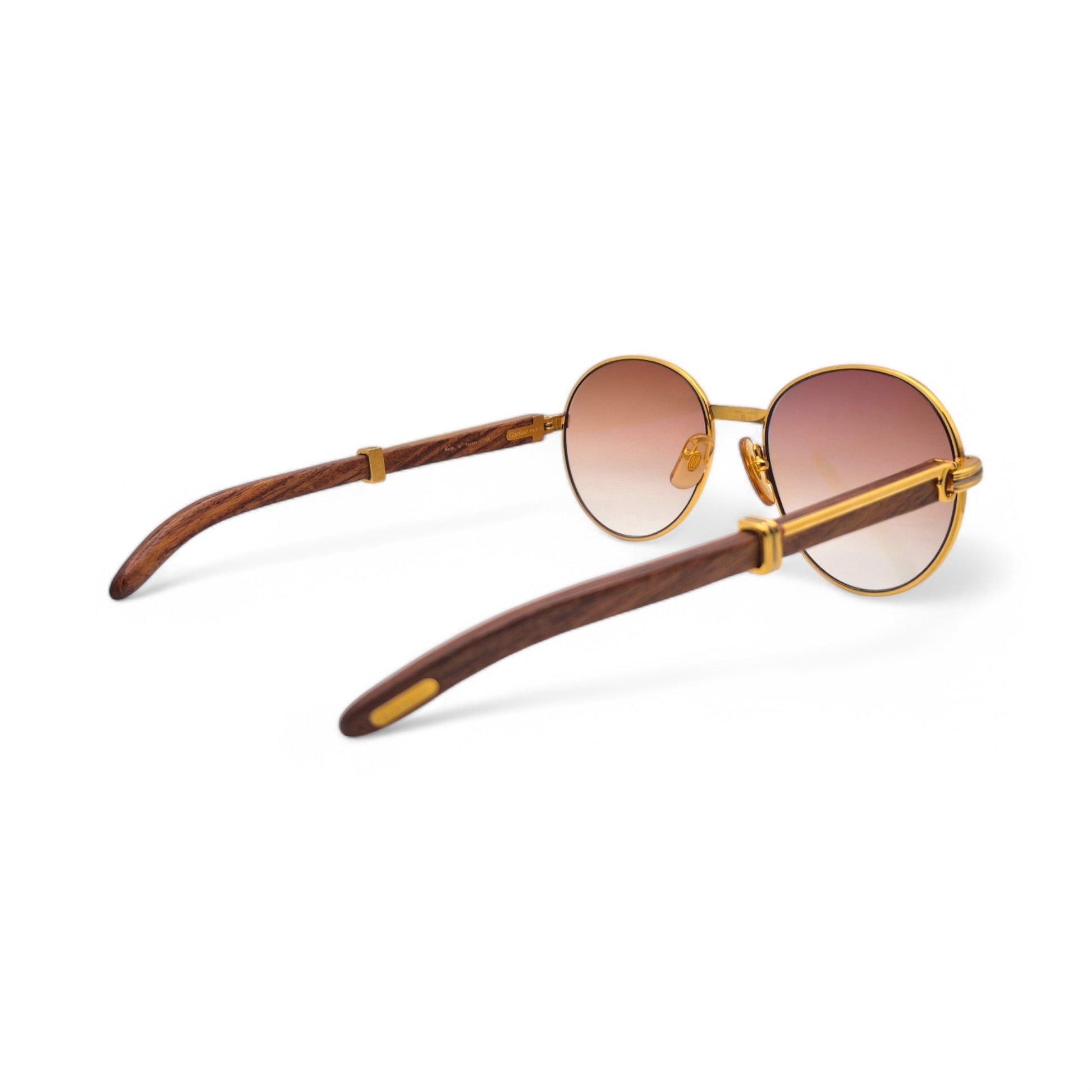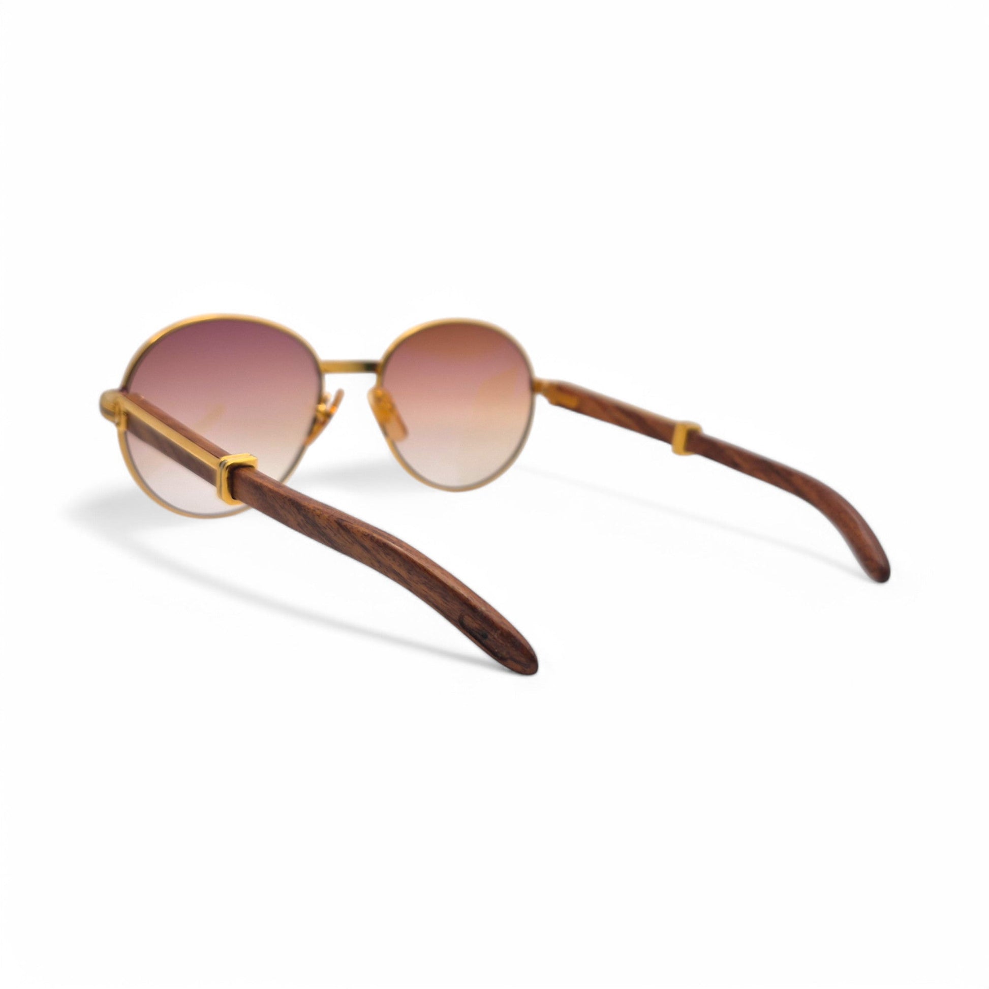 Crafted with a gold full frame and wood temples, the iconic Cartier Bagatelle exudes timeless elegance and sophistication. They are available in Light Henessy Brown and Olive Brown lenses.