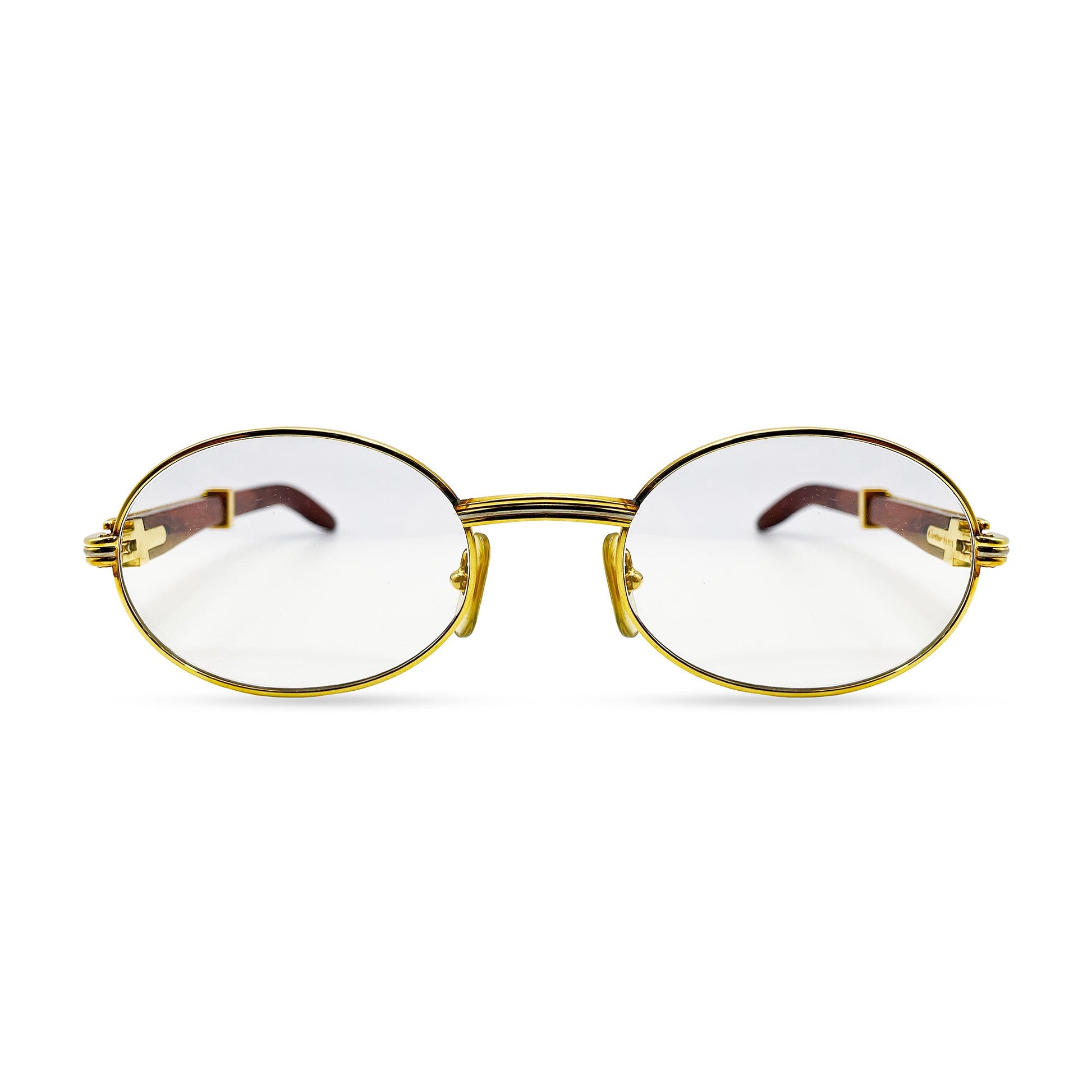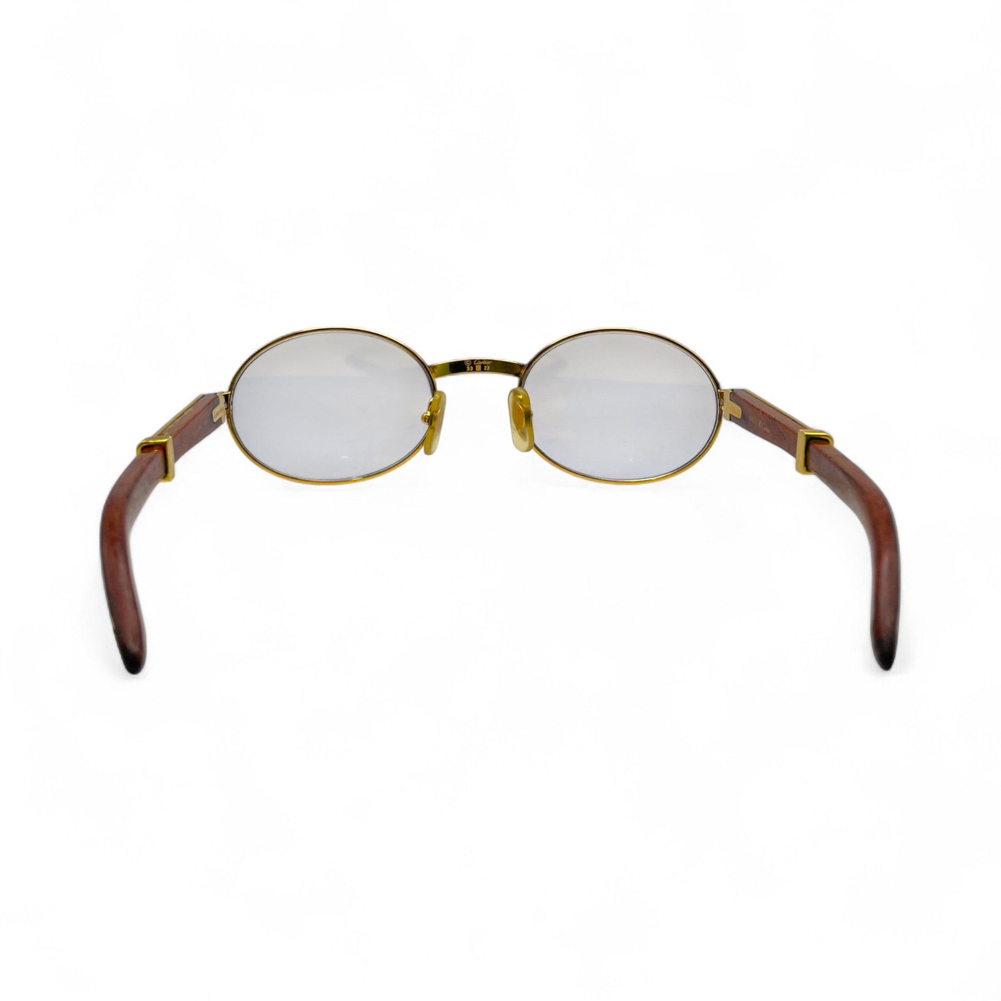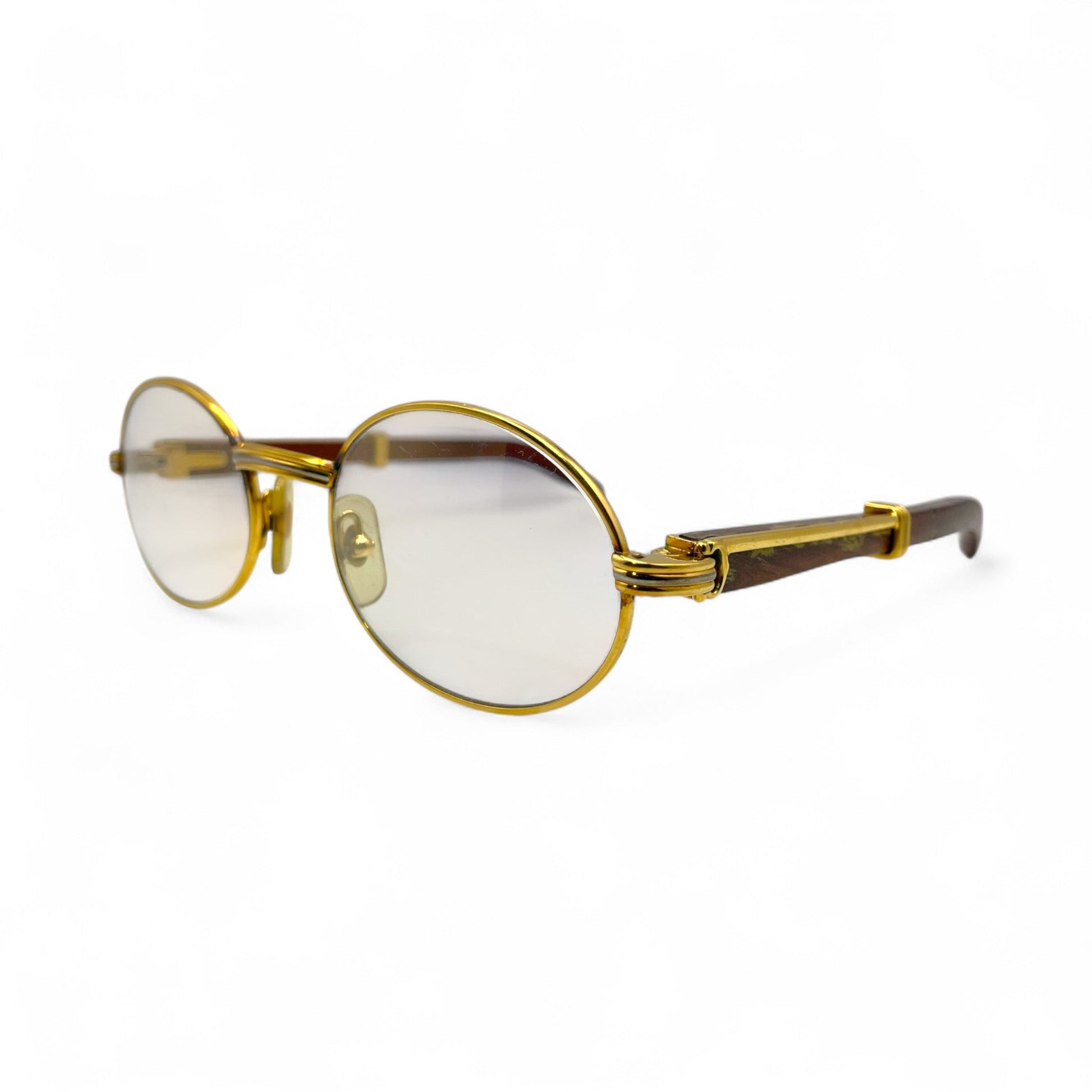 Discounted since the 90s, these vintage gold Cartier Giverny Sunglasses are featured with rosewood temples and honey brown 22kt gold plated frame. They come with clear or clear transtional lenses with a premium AR coating. This glasses are super hard to find, the timeless design will be a keeper in your collection.