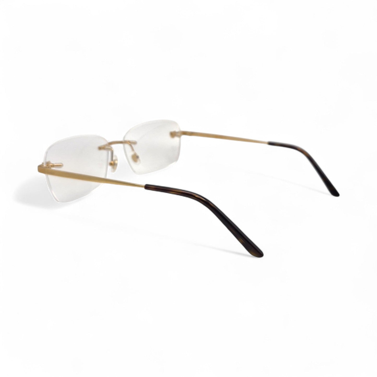 This rimless eyeglasses comes with wire (metal) temples and clear lenses. They feature an iconic panthere on the front of the hinges.