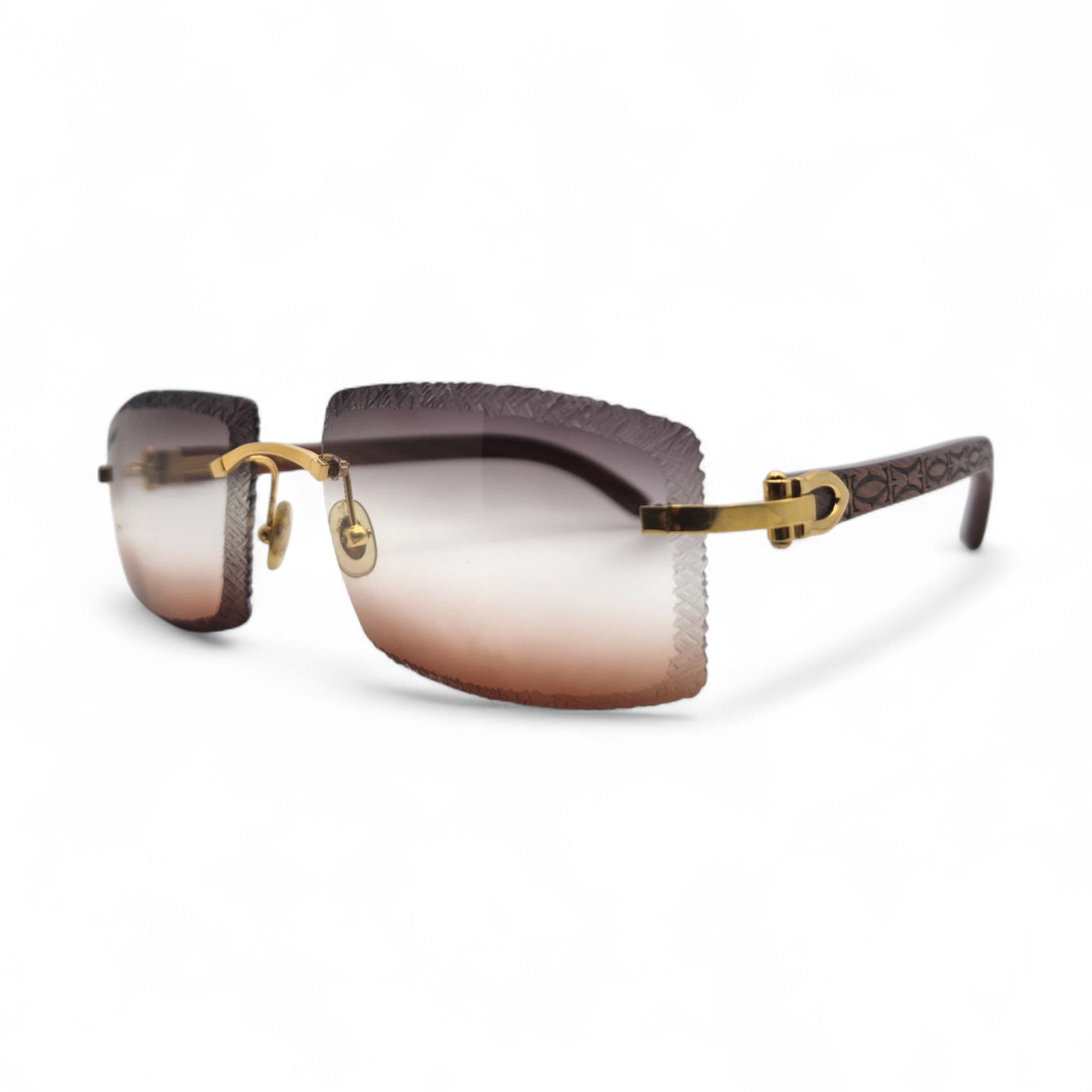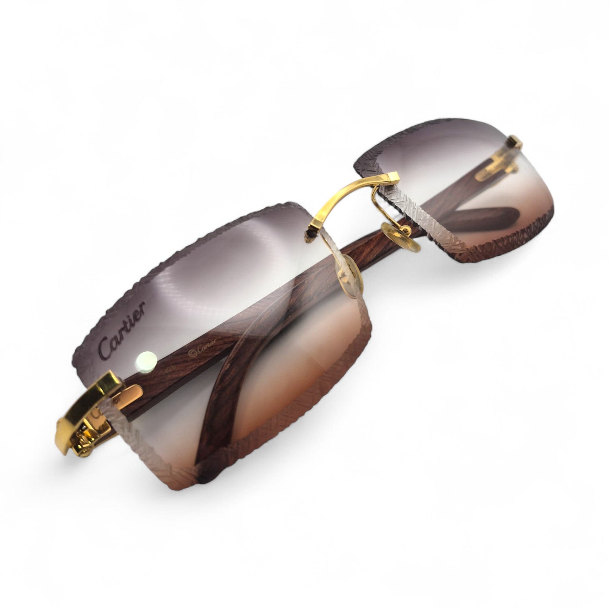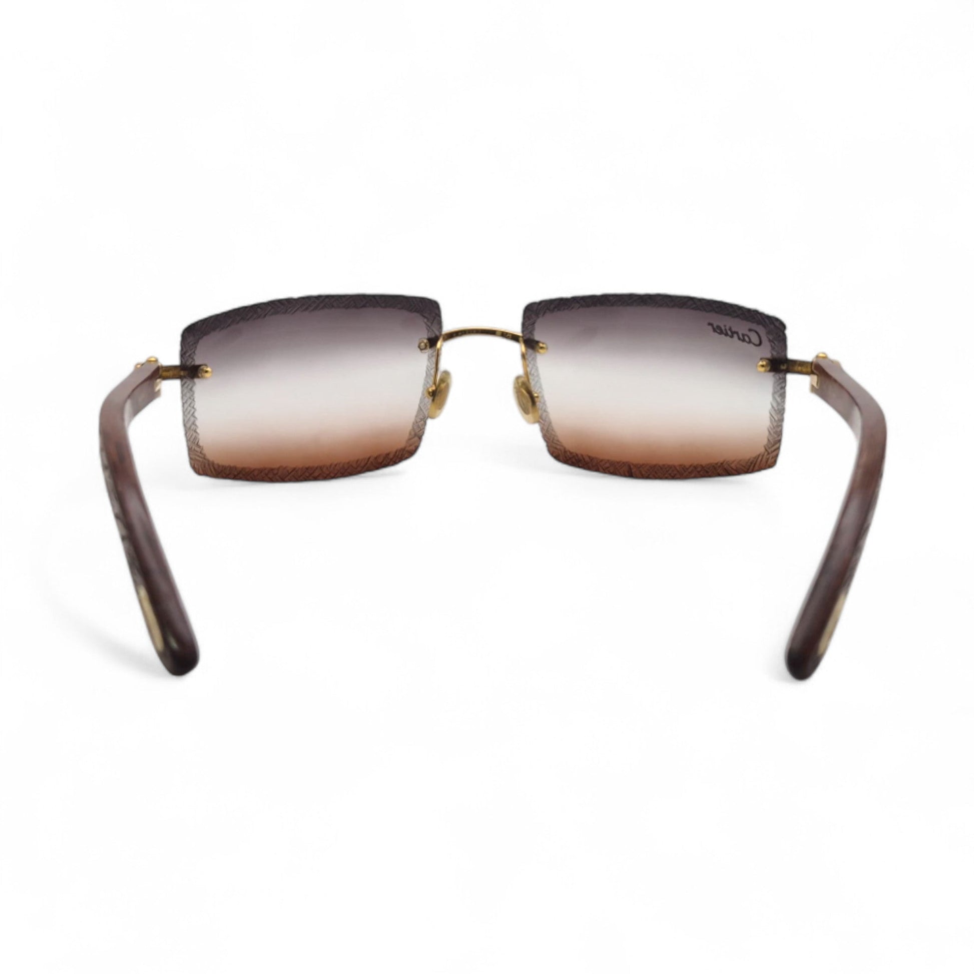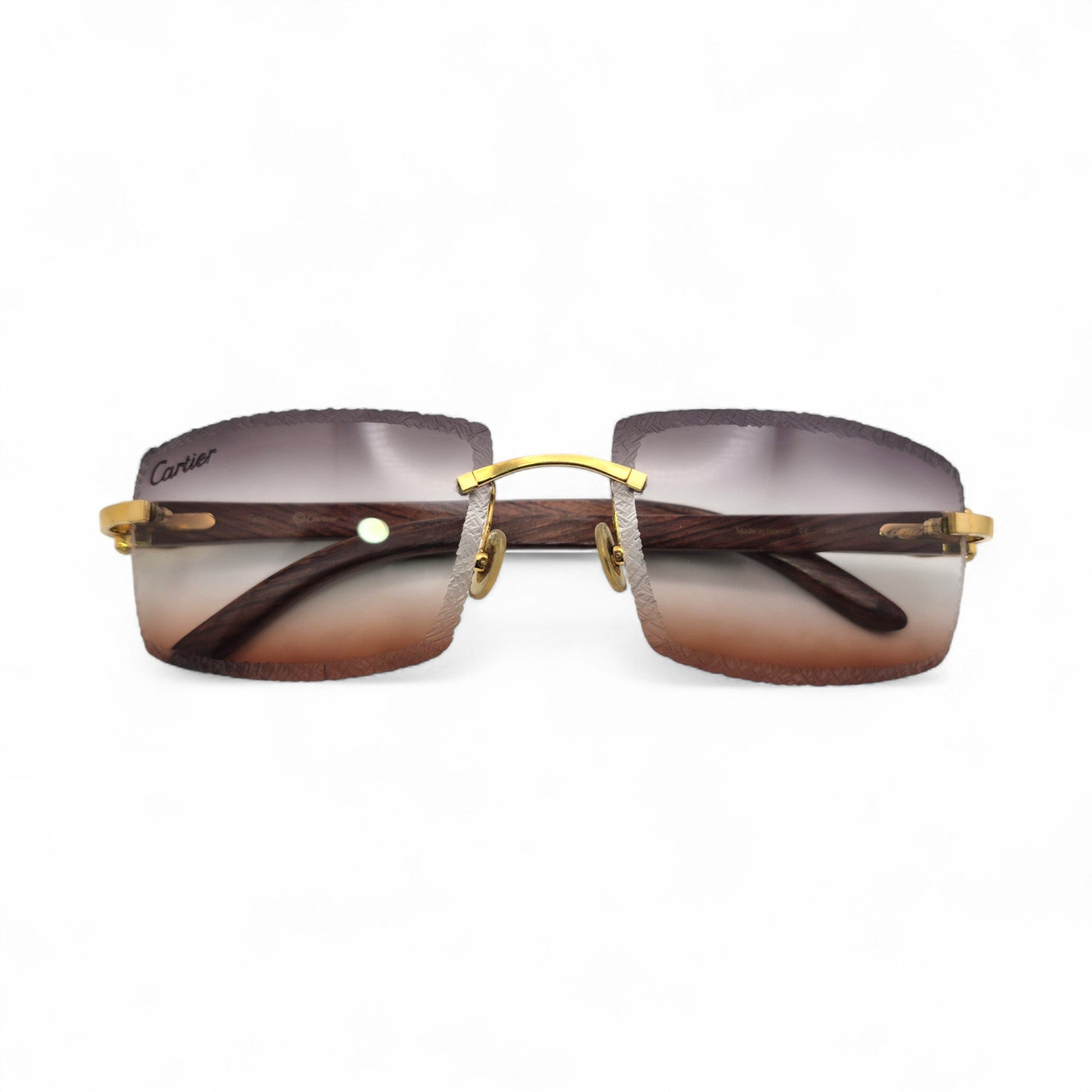 This authentic Limited Edition Cartier C Decor sunglasses comes with a gold rimless frame, logo wood temples and smoke gray to clear to brown gradient lenses, featuring an exclusive cut on the lenses borders.