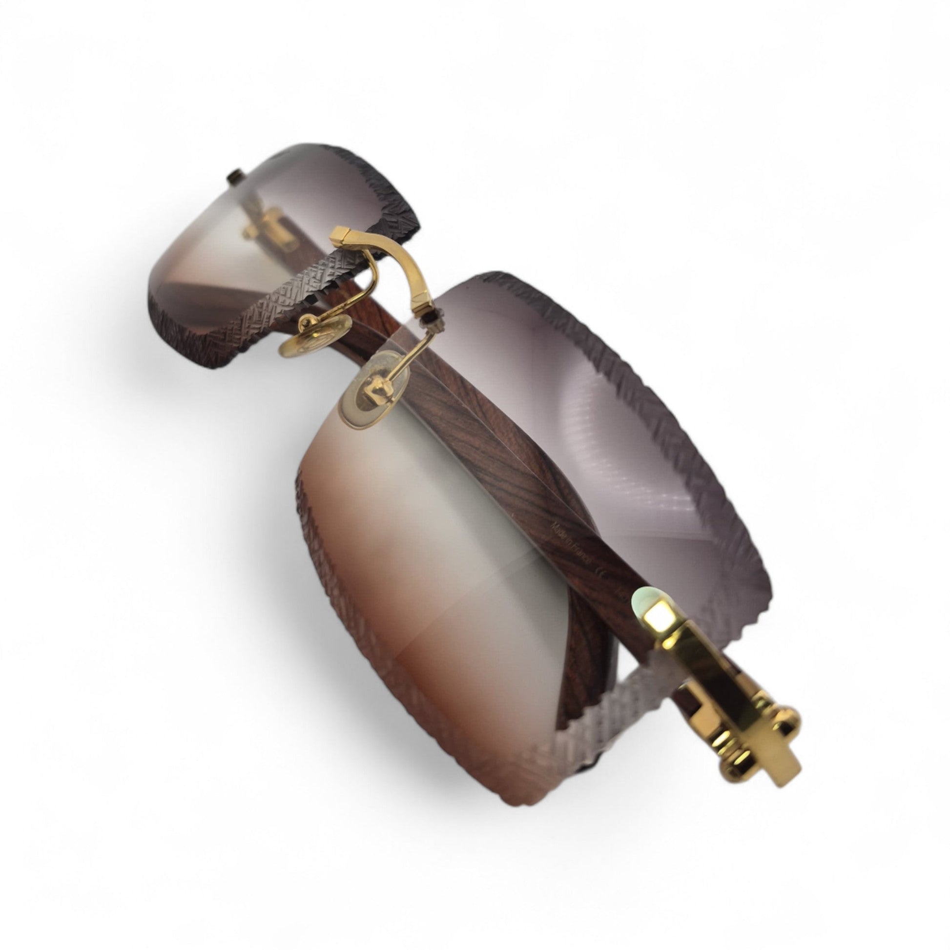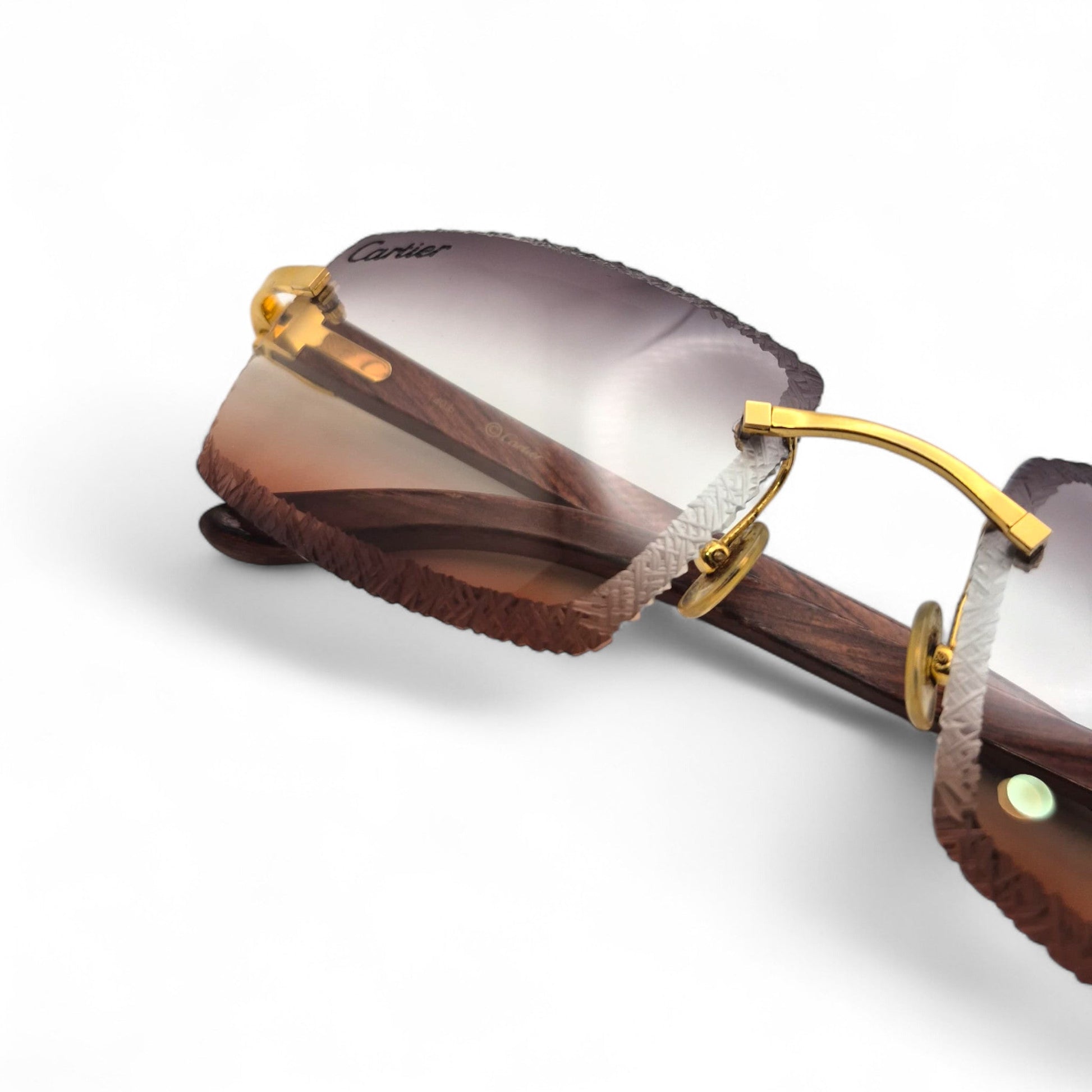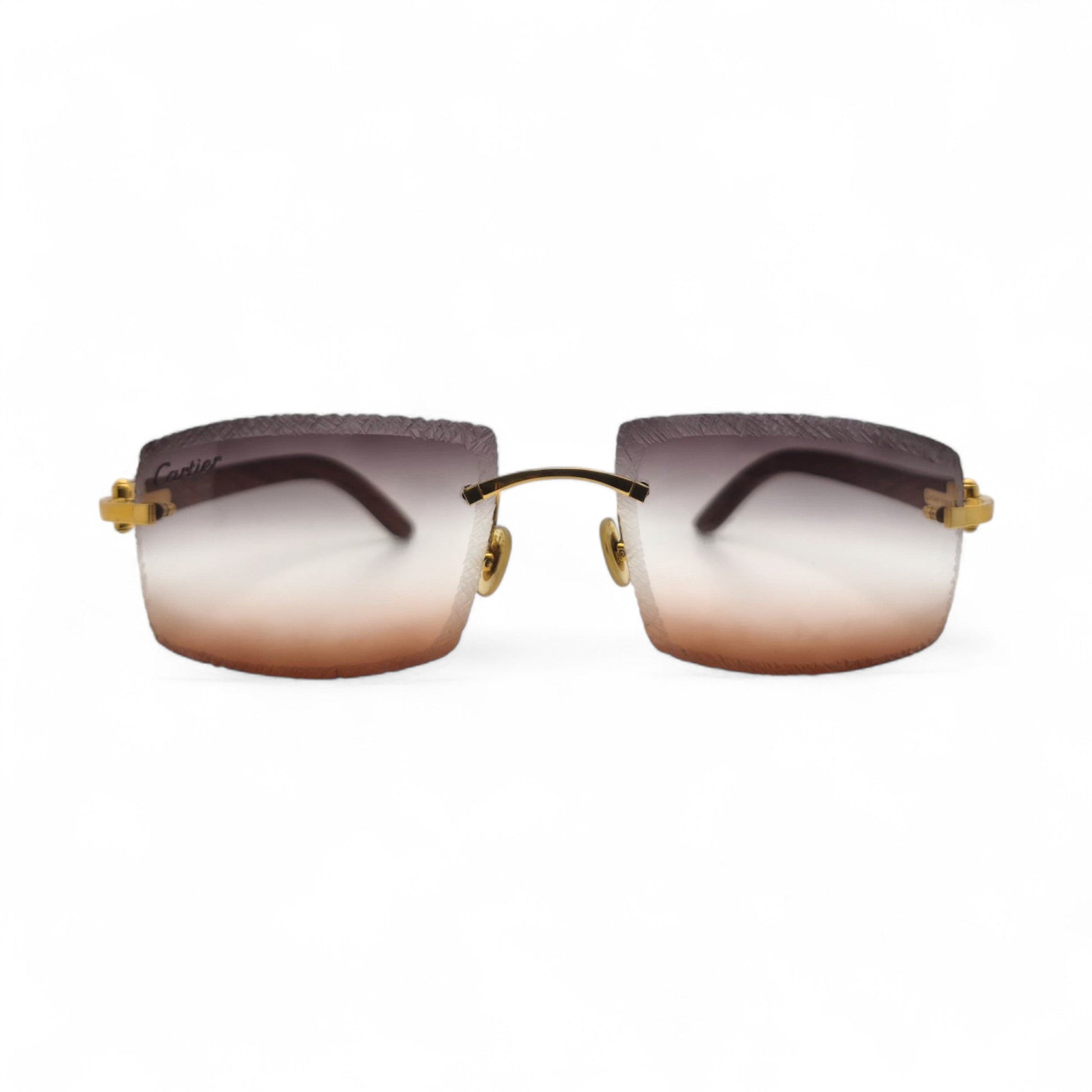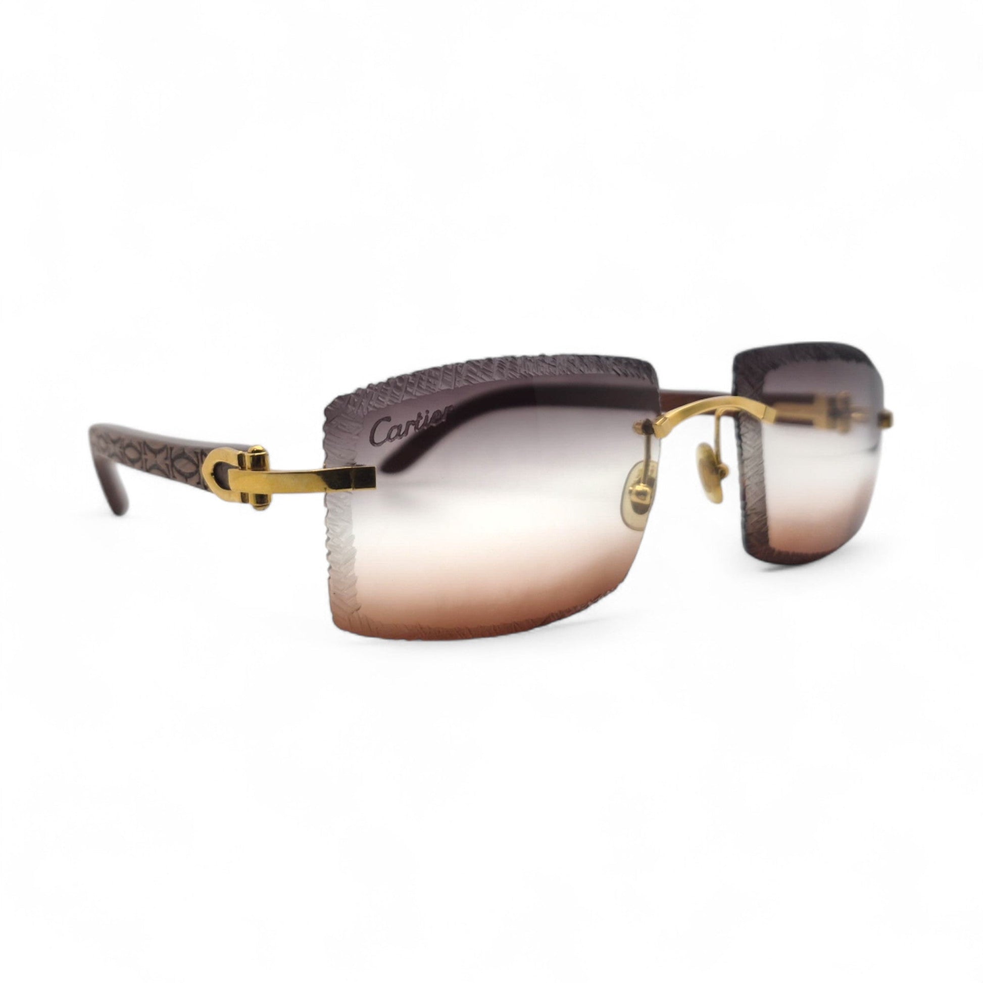 This authentic Limited Edition Cartier C Decor sunglasses comes with a gold rimless frame, logo wood temples and smoke gray to clear to brown gradient lenses, featuring an exclusive cut on the lenses borders.