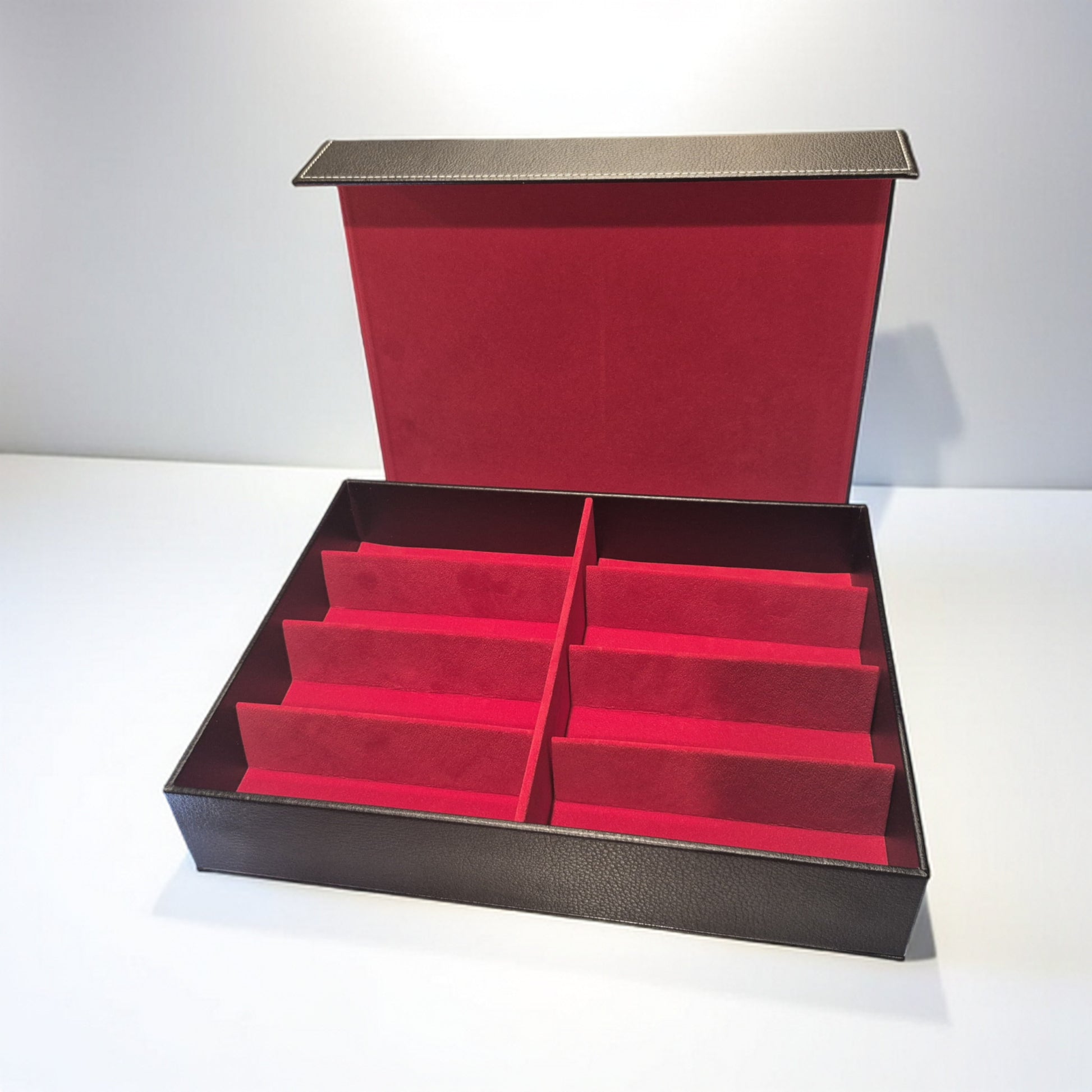 The Cafr deluxe eyeglasse box holds up to 8 pairs of eyeglasses/sunglasses, it has a soft red velvet inside and a durable hard cover. It is the best storage option for your glasses, making sure they are protected while scratch-free.