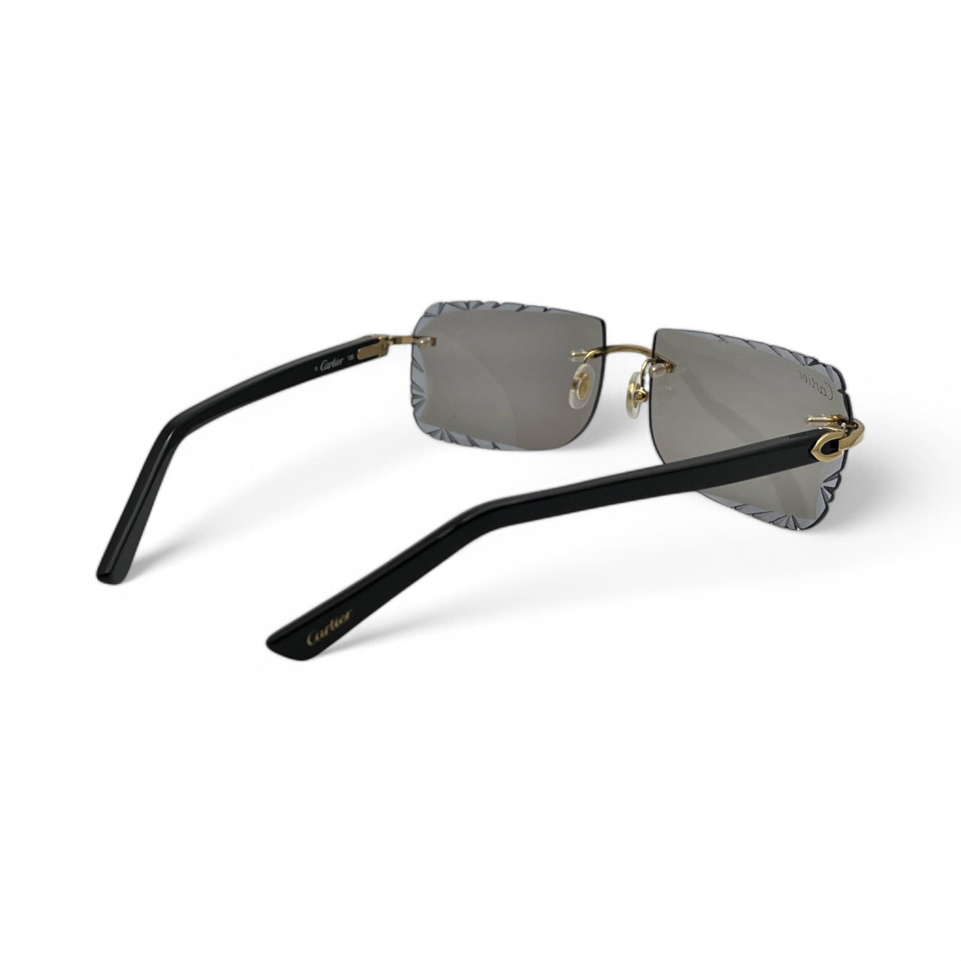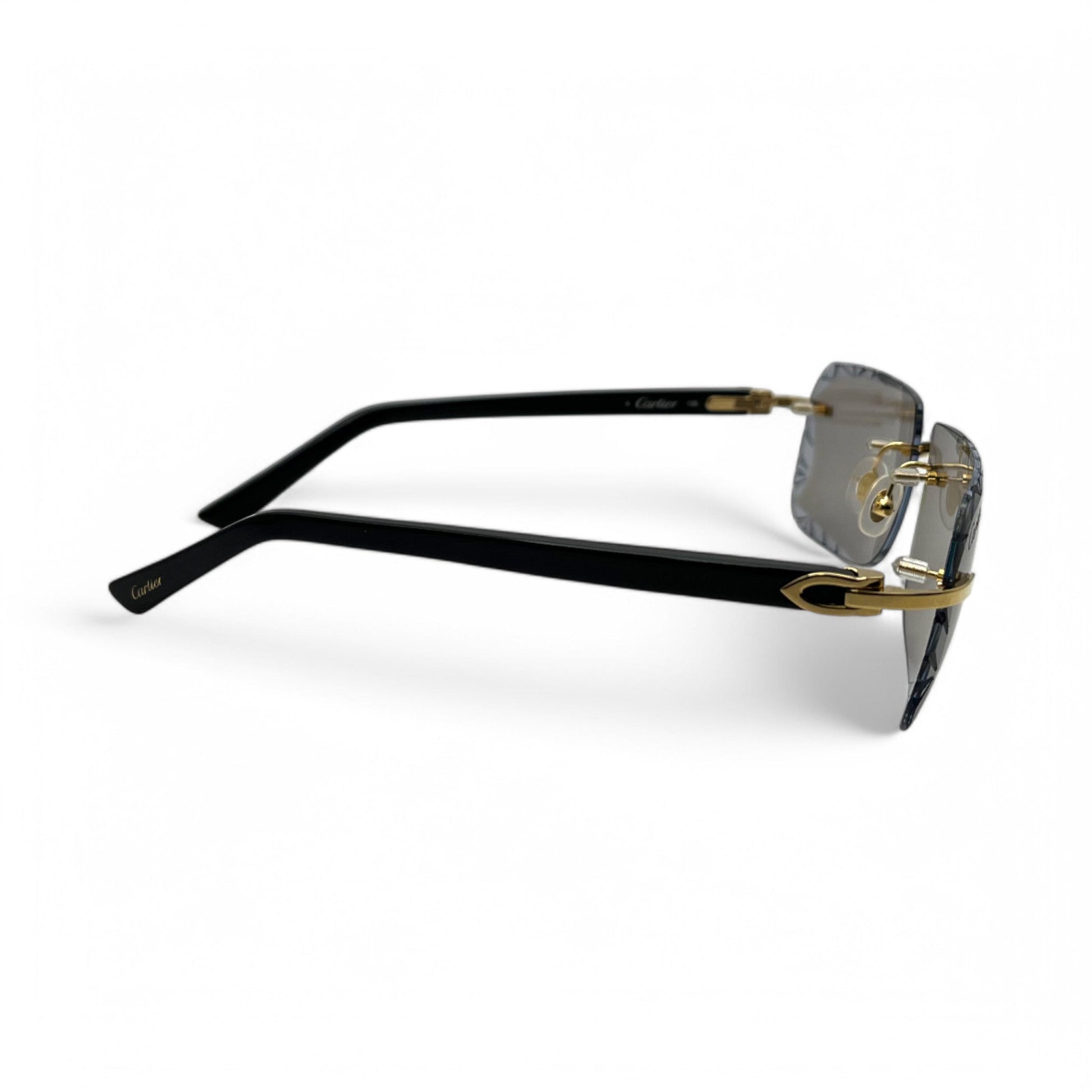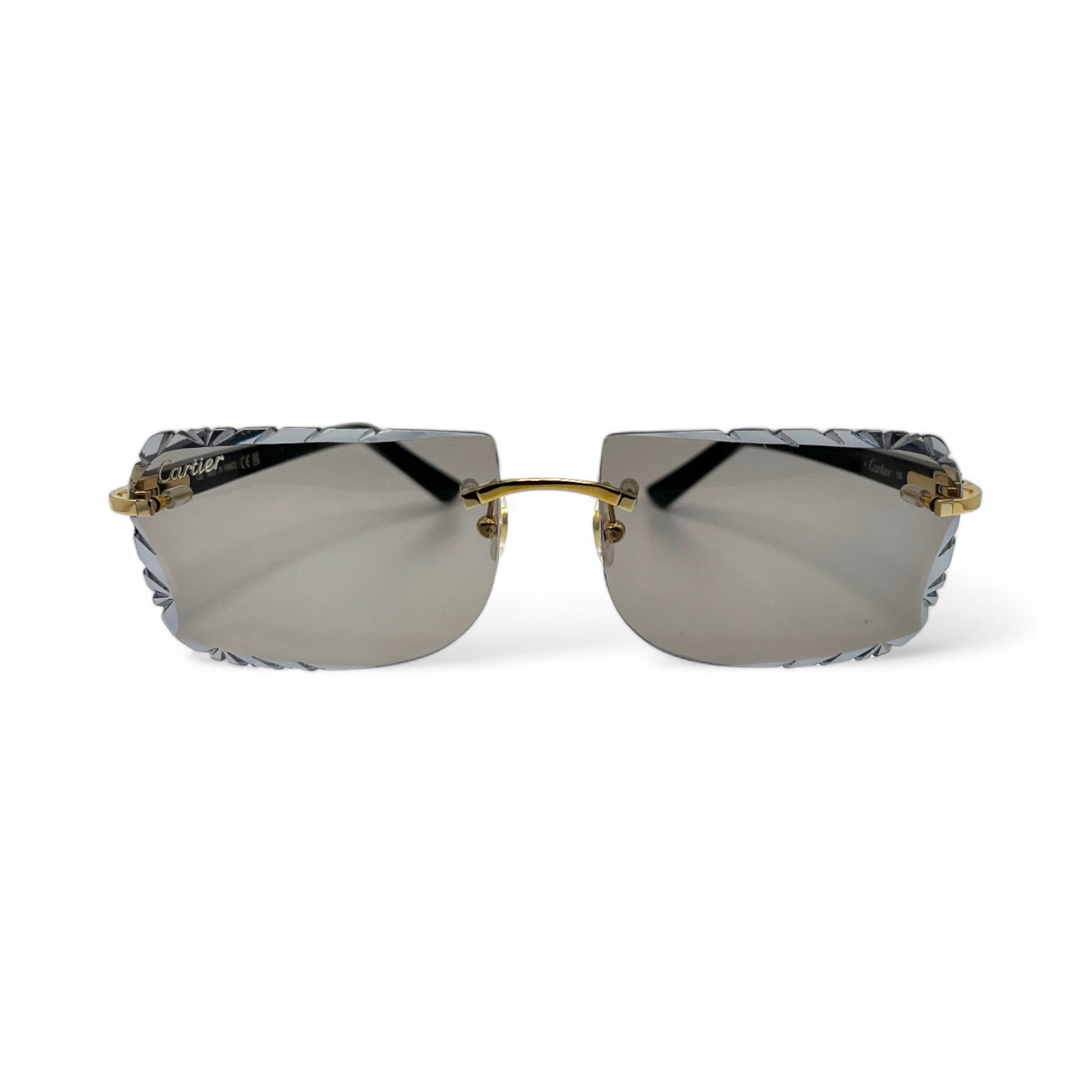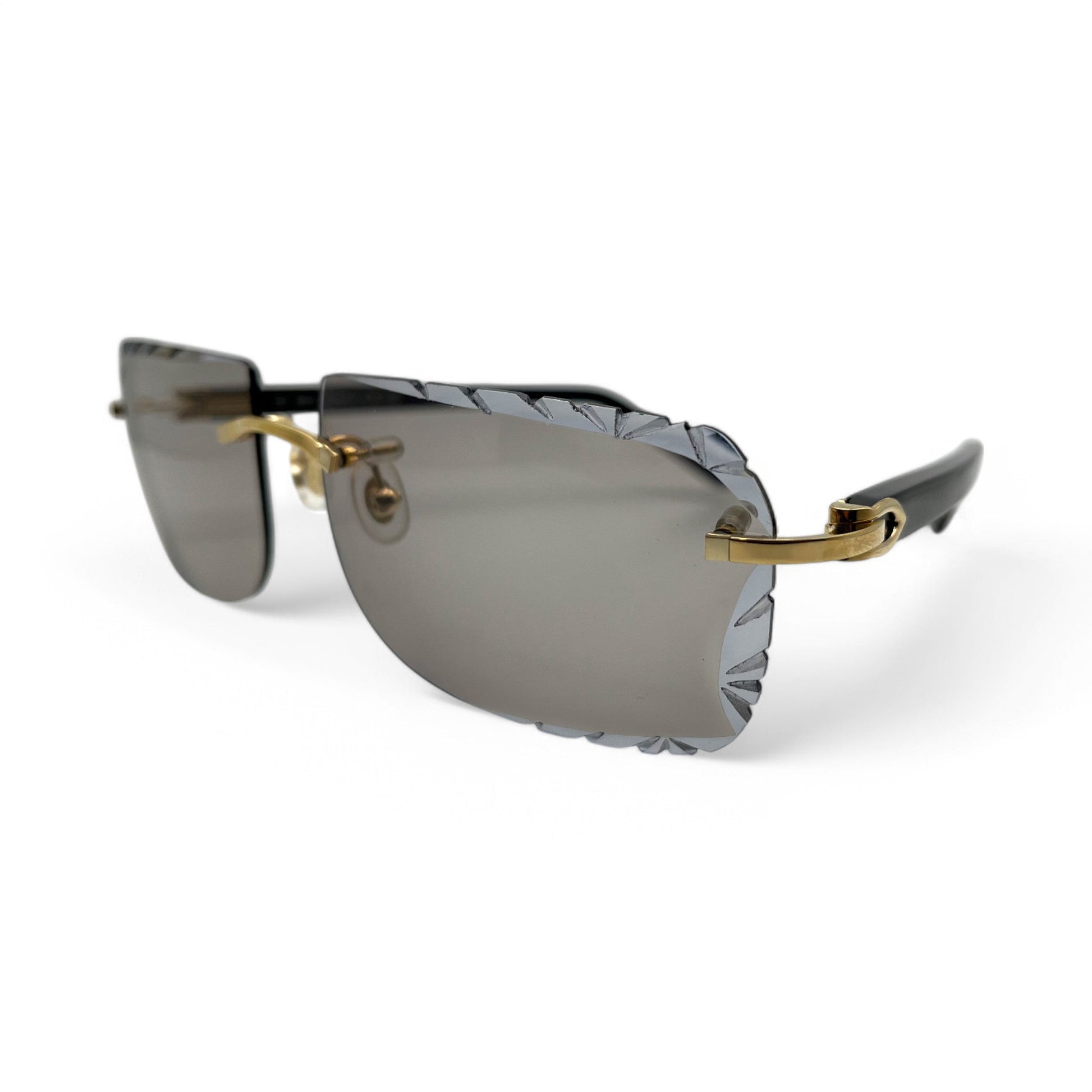 This authentic Cartier C Decor comes with a gold rimless frame with black acetate marble temples and light gray #3 lenses with a custom diamond cut.