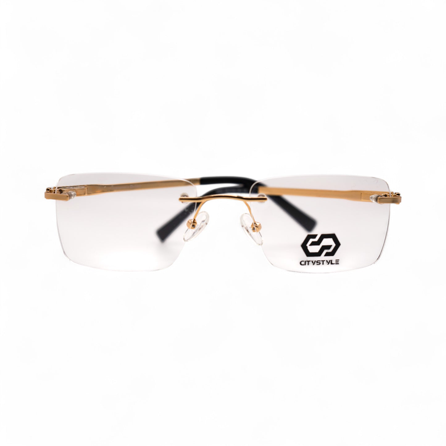 These eyeglasses combine style and function with a rimless frame and wire temples that provide a comfortable and secure fit. Choose from gold with acetate tortoise on the temple tips, gold with brown accents, or silver with blue accents.
