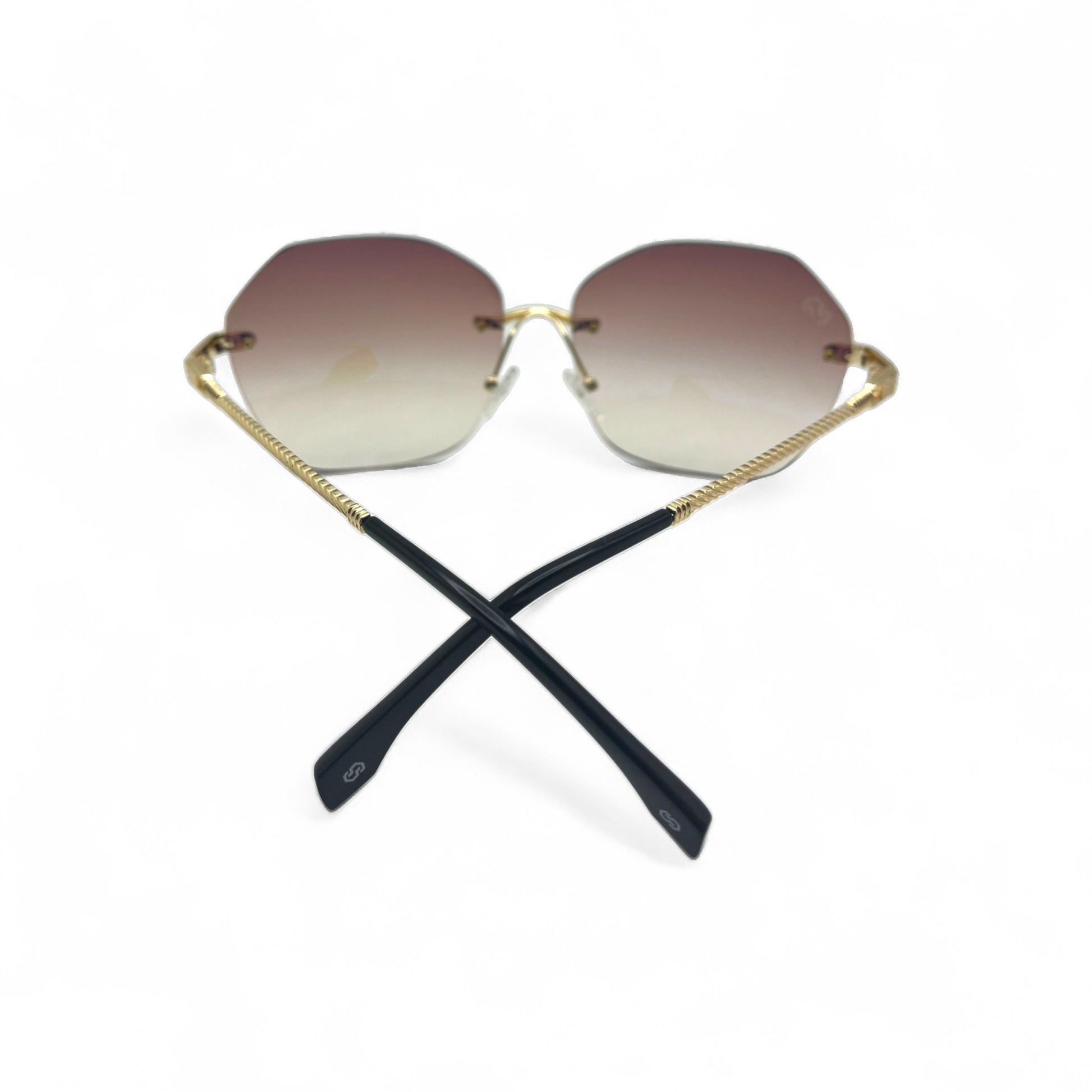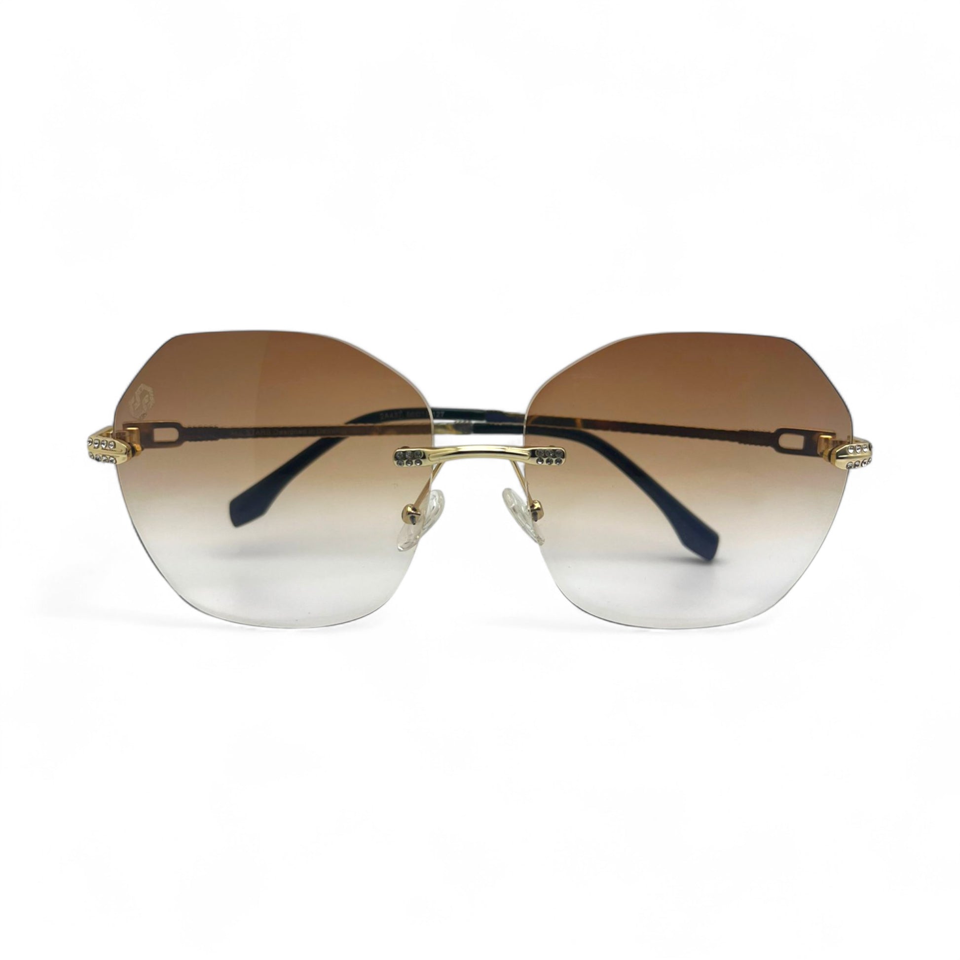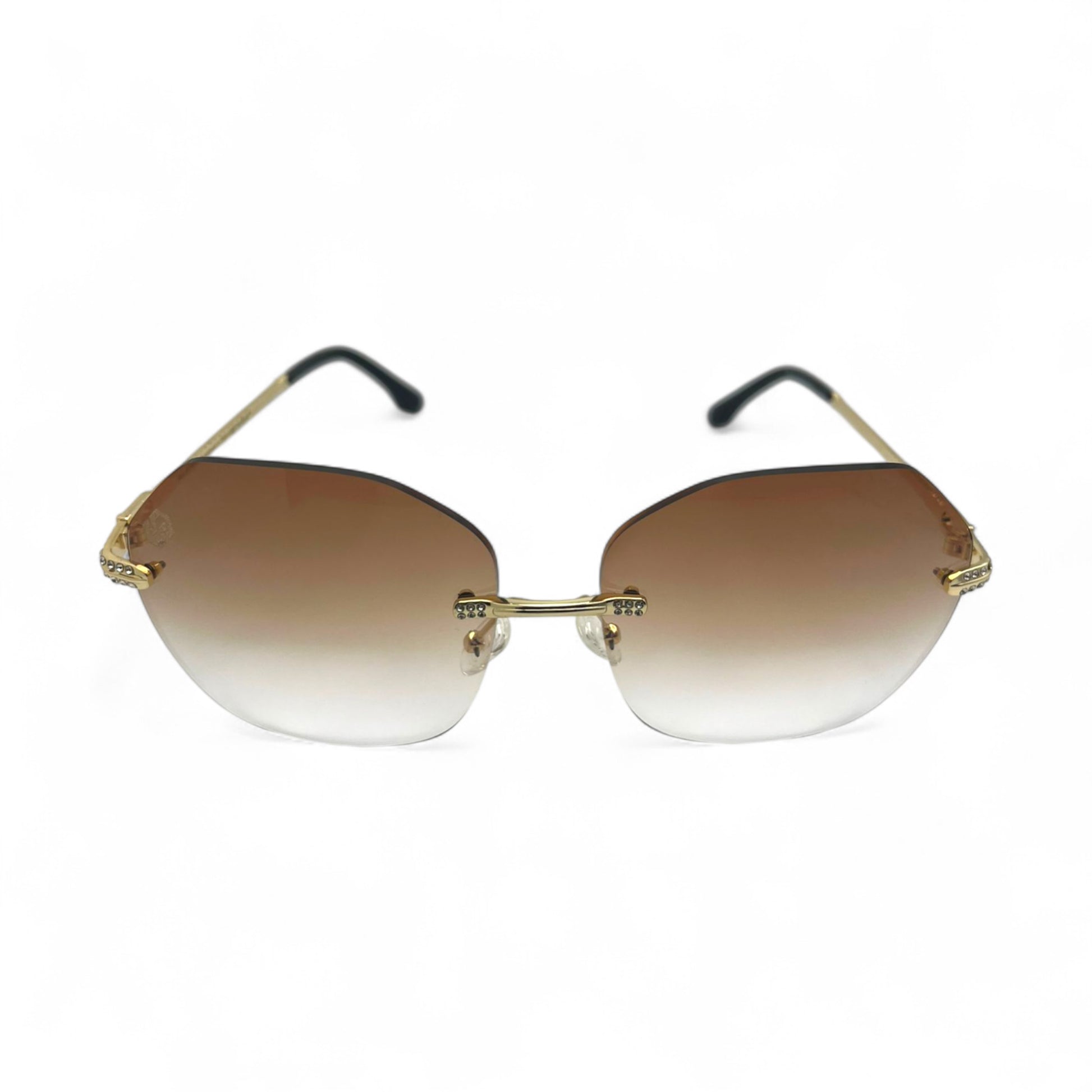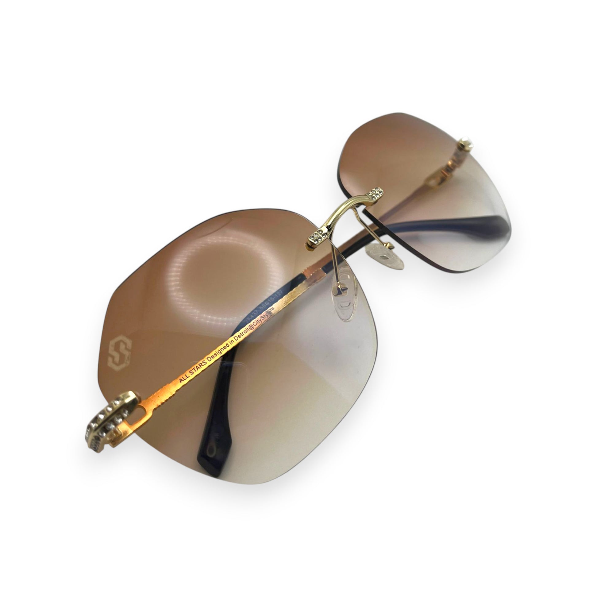 The CityStyle™ Allstars sunglasses are one of our best models, designed with CZ diamonds in the hinges and a cut on the lenses for that special touch of luxury. They are one of our most requested pairs for customization. This variant is customized with brown gradient lenses in a custom shape.