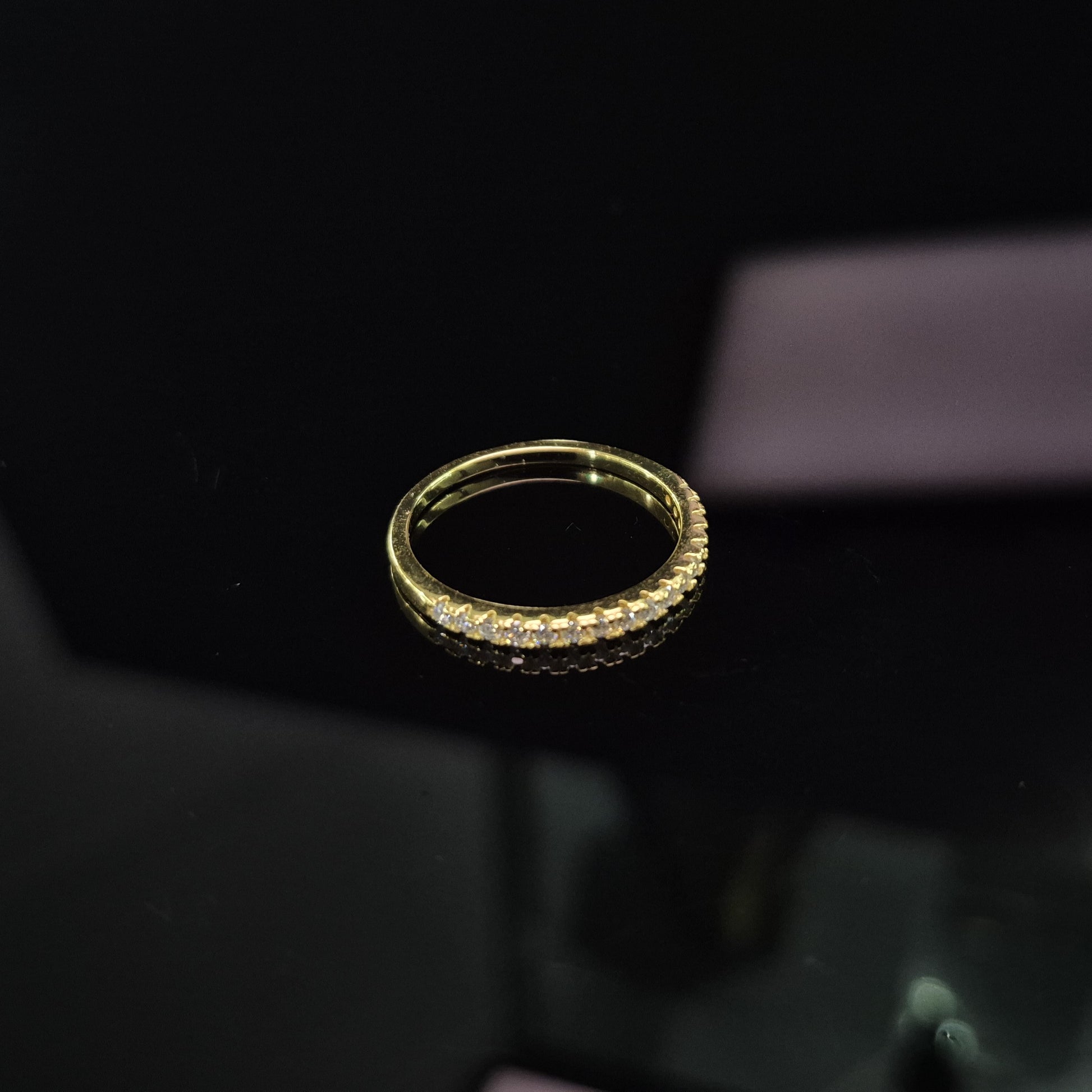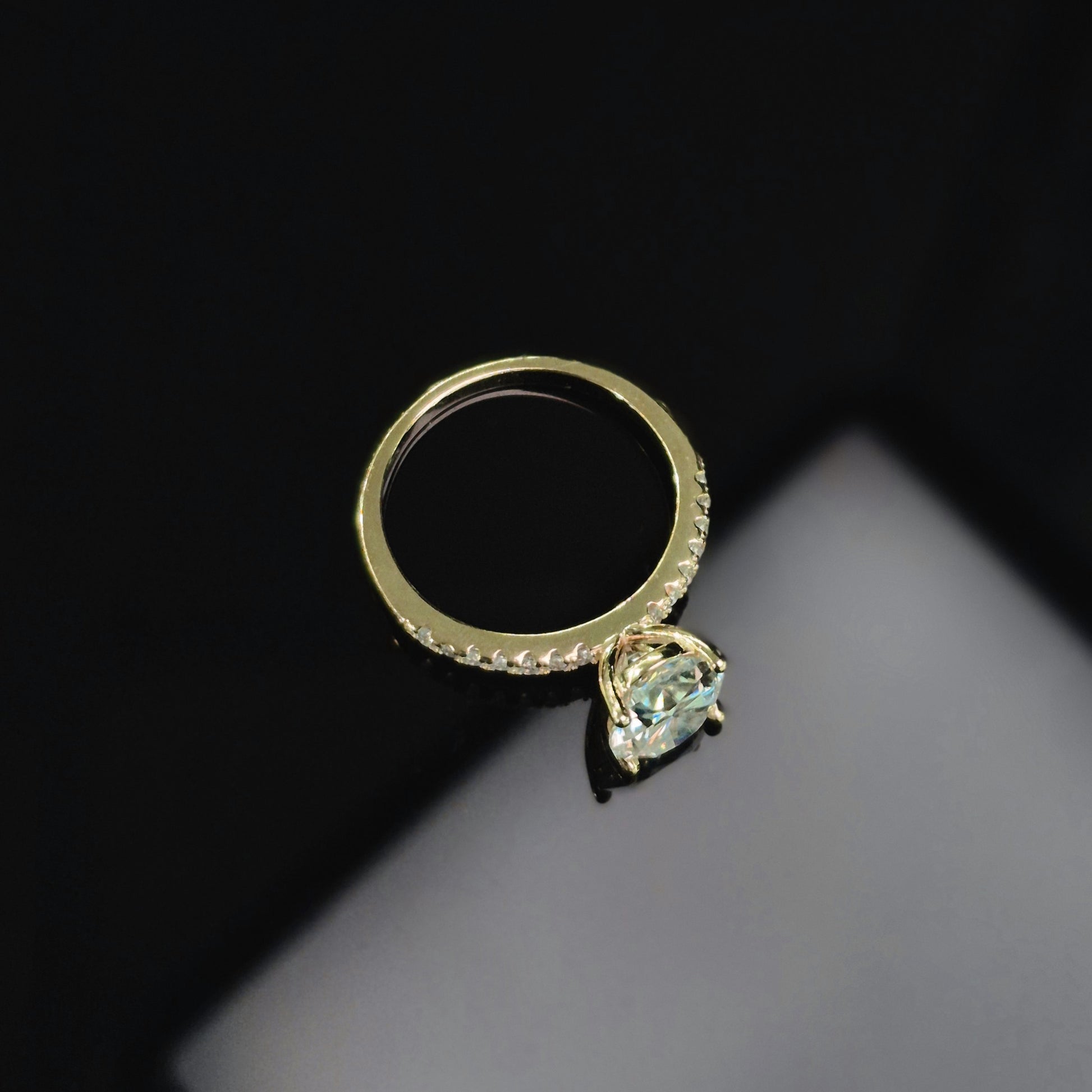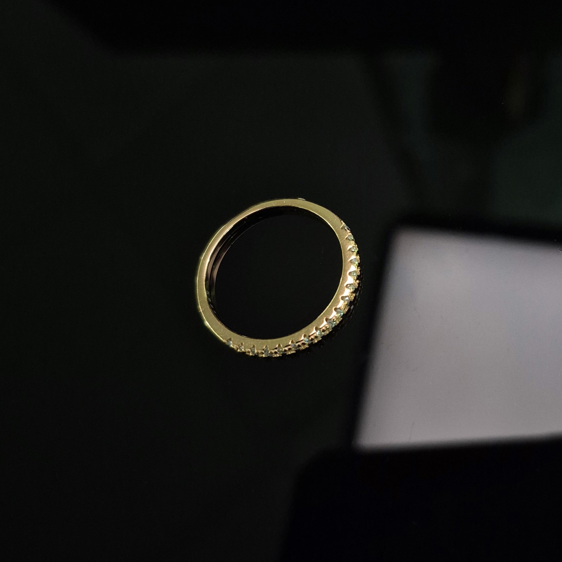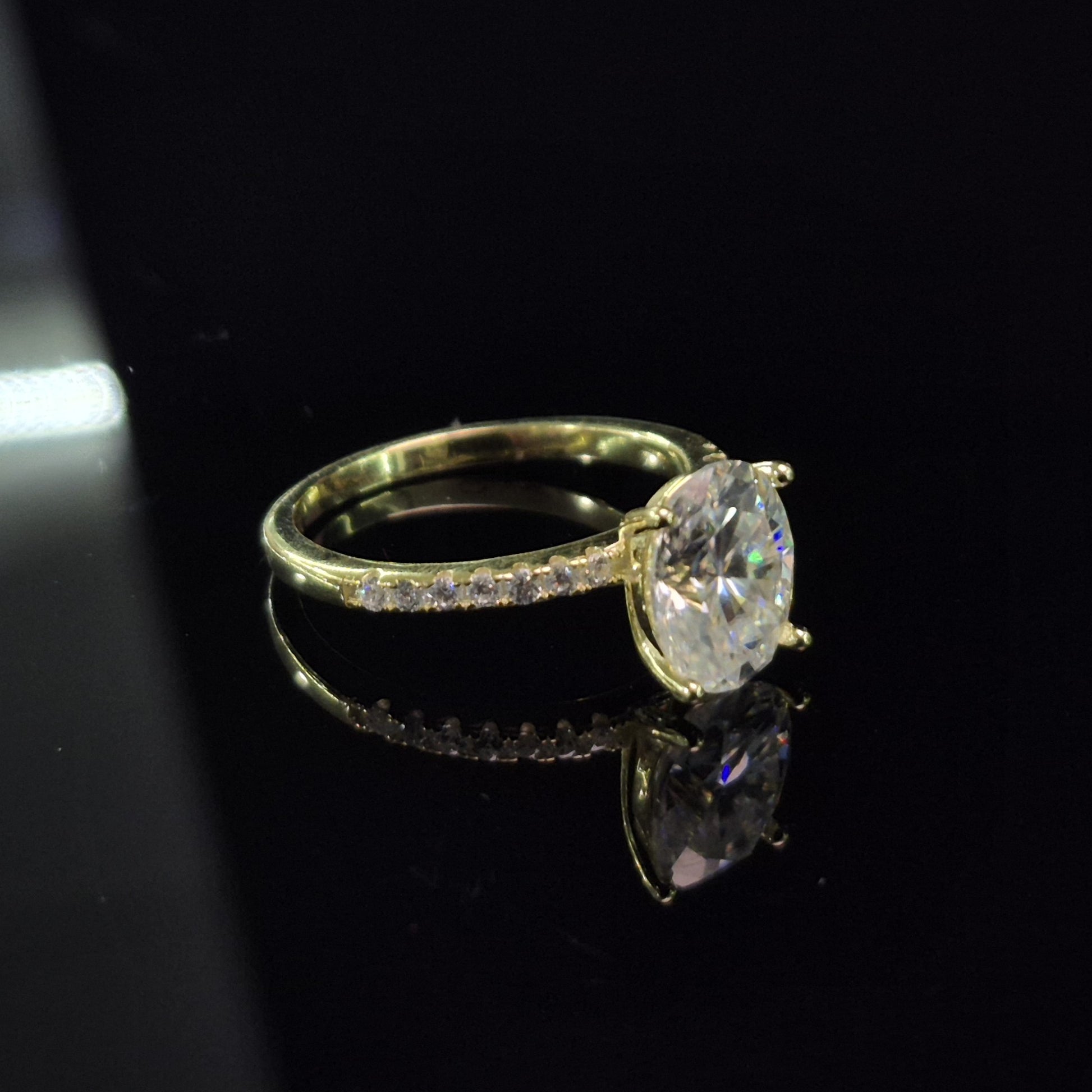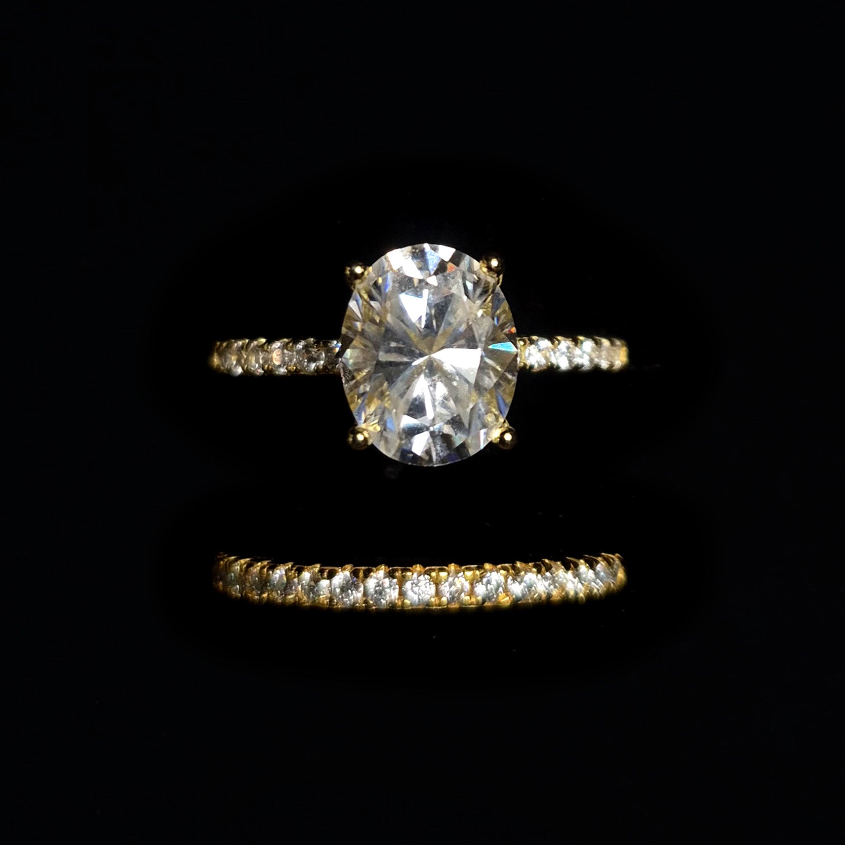 This sterling silver gold-plated oval diamond ring is set with a 4-prong head, along with multiple stones in the band. This is a 2-piece set, the oval diamond ring comes with a secondary diamonds band ring, perfect to use together or to gift to your special one.