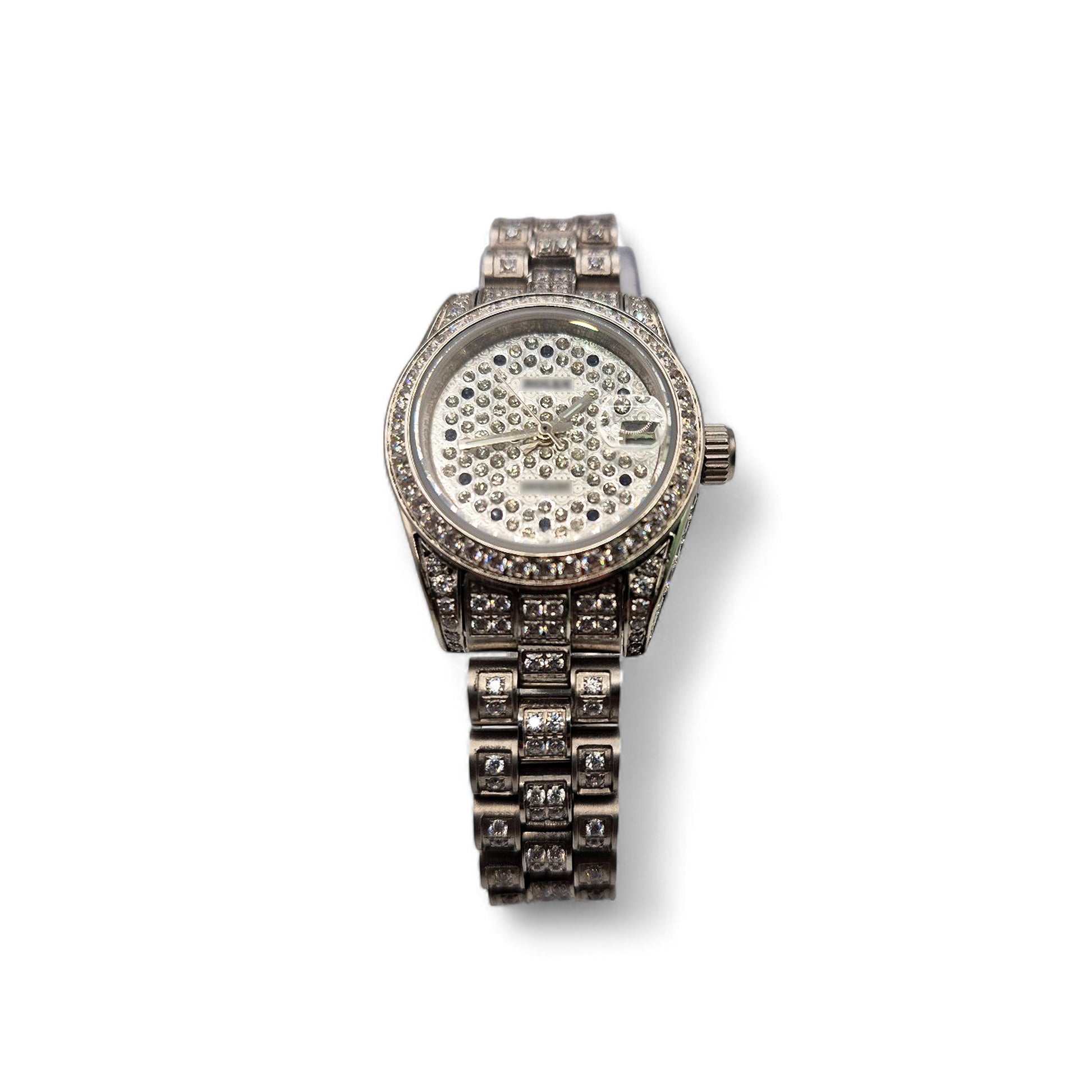 Iced out RLX DTJ silver watch with silver dial and black CZ stones hour markers.