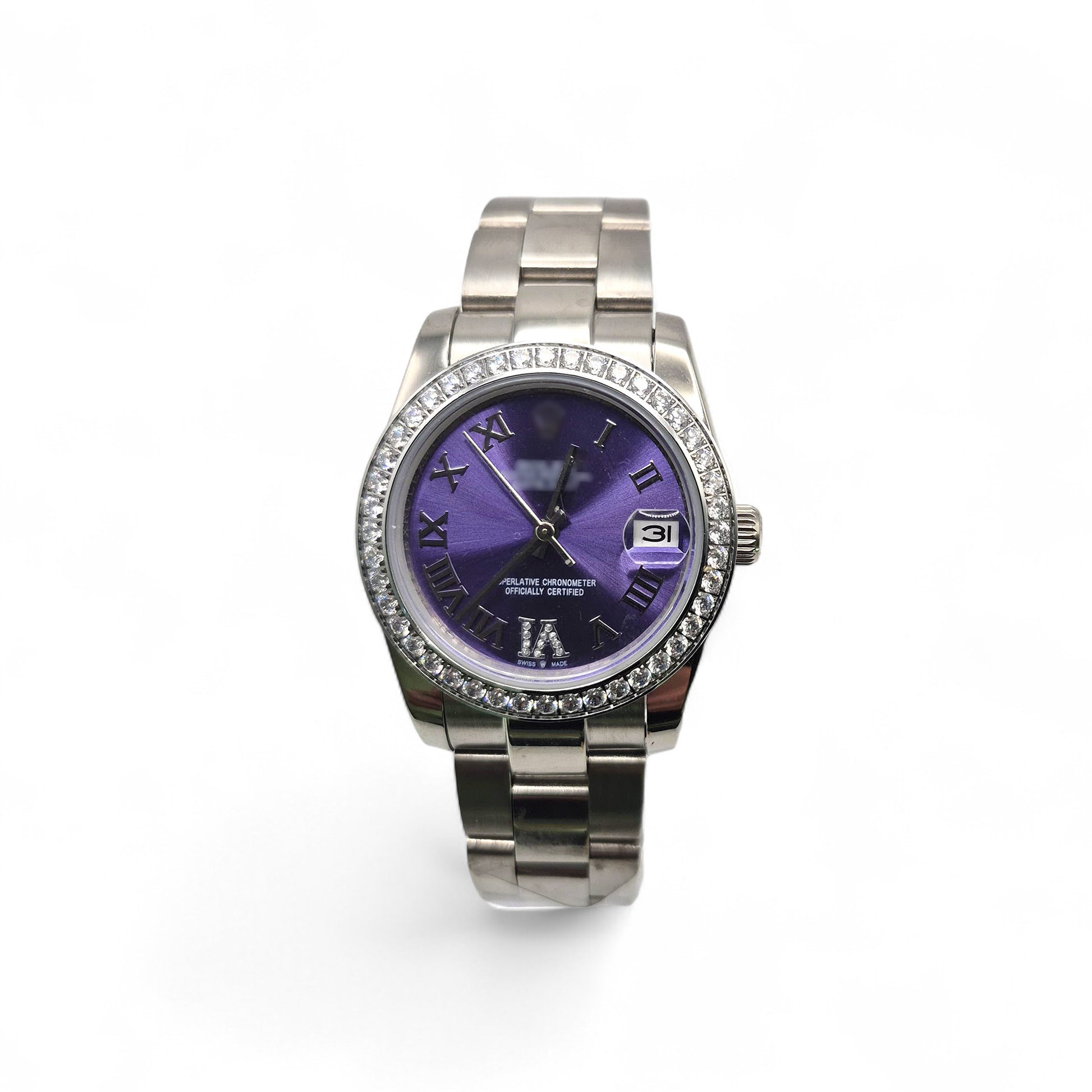 RLX DTJ silver watch with CZ diamonds bezel, purple dial and roman hour markers.