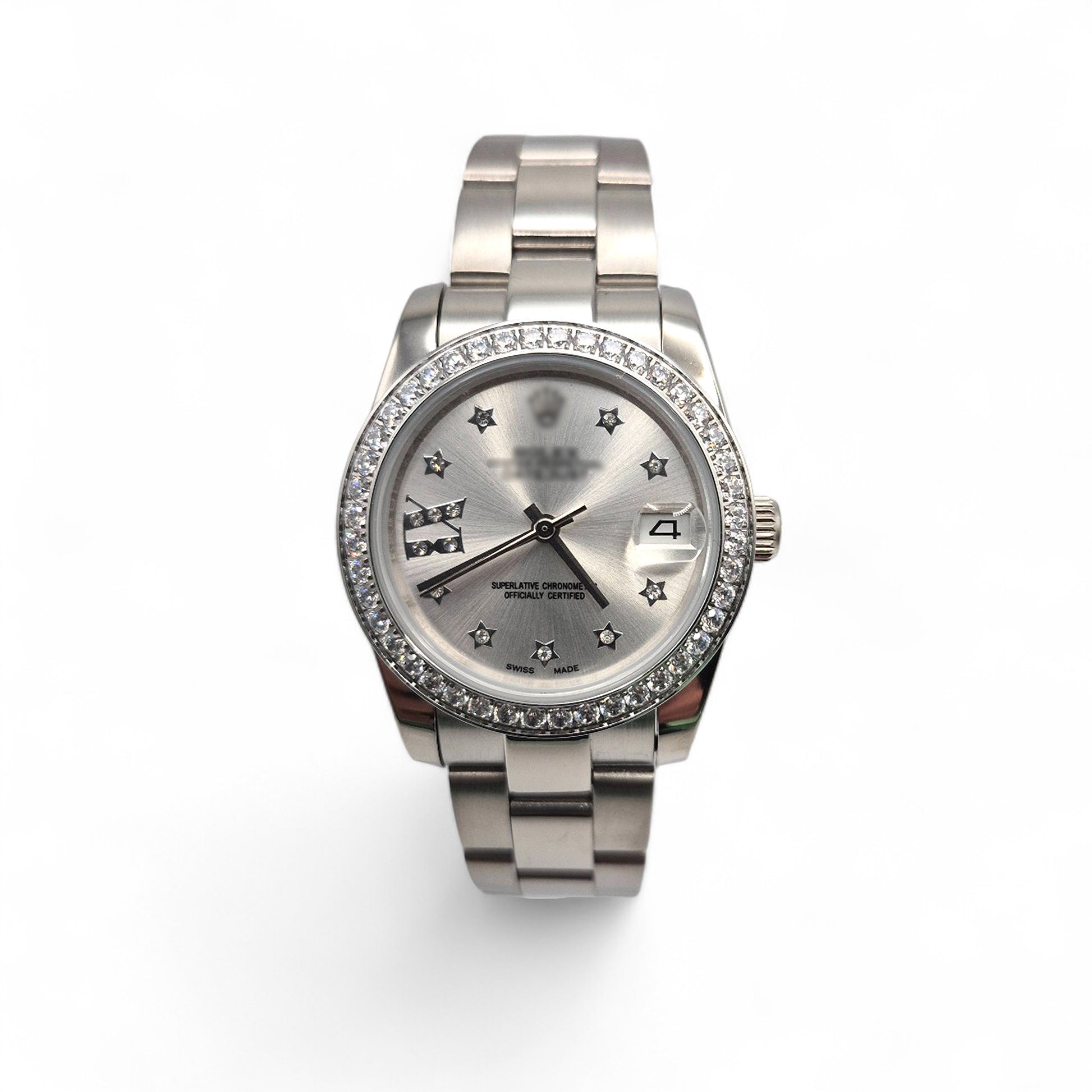 RLX DTJ silver watch with CZ diamonds bezel, silver dial and CZ diamonds stars hour markers.