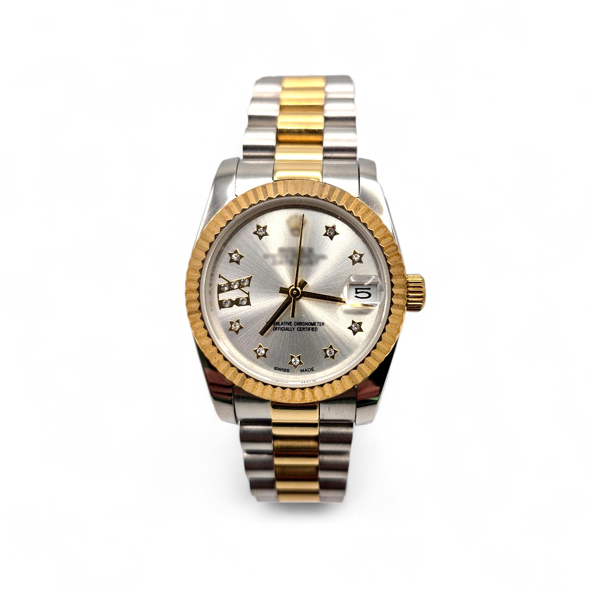 RLX DTJ two-tone watch (silver and yellow gold) with fluted bezel, silver dial and CZ diamond stars hour markers.
