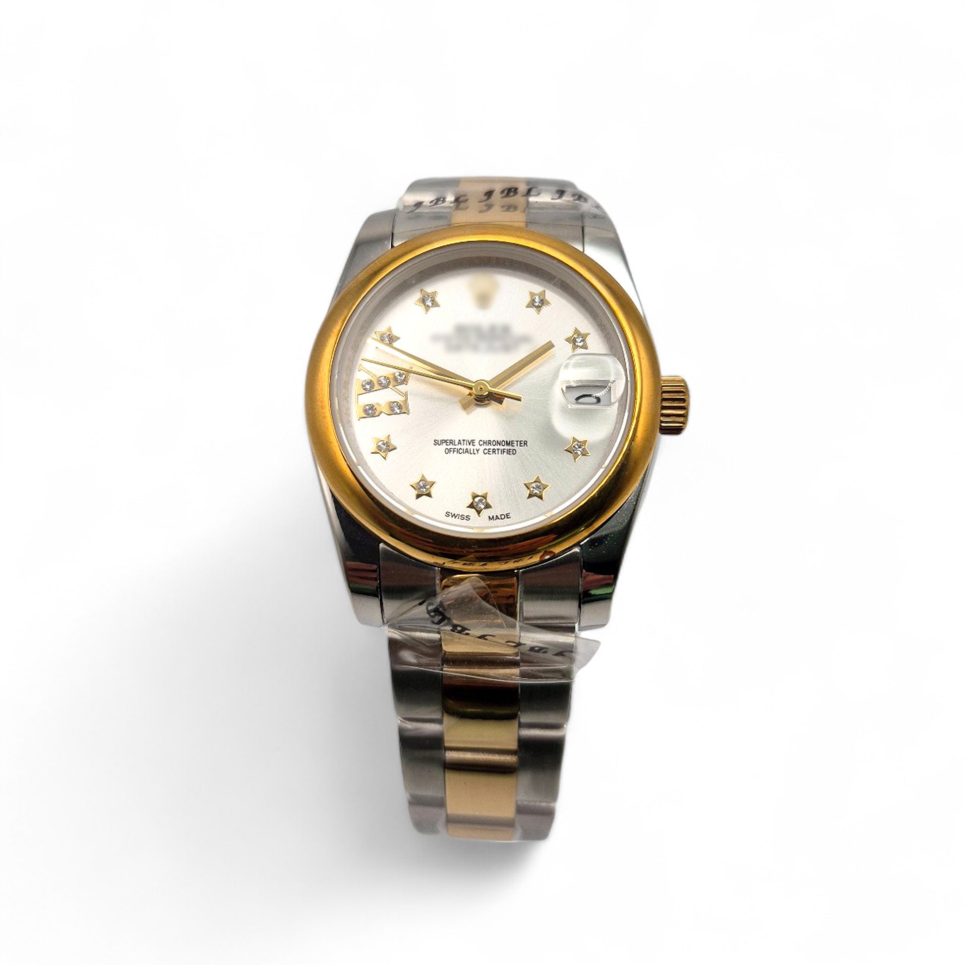 RLX DTJ two-tone watch (silver and yellow gold) with smooth bezel, silver dial and CZ diamond stars hour markers.