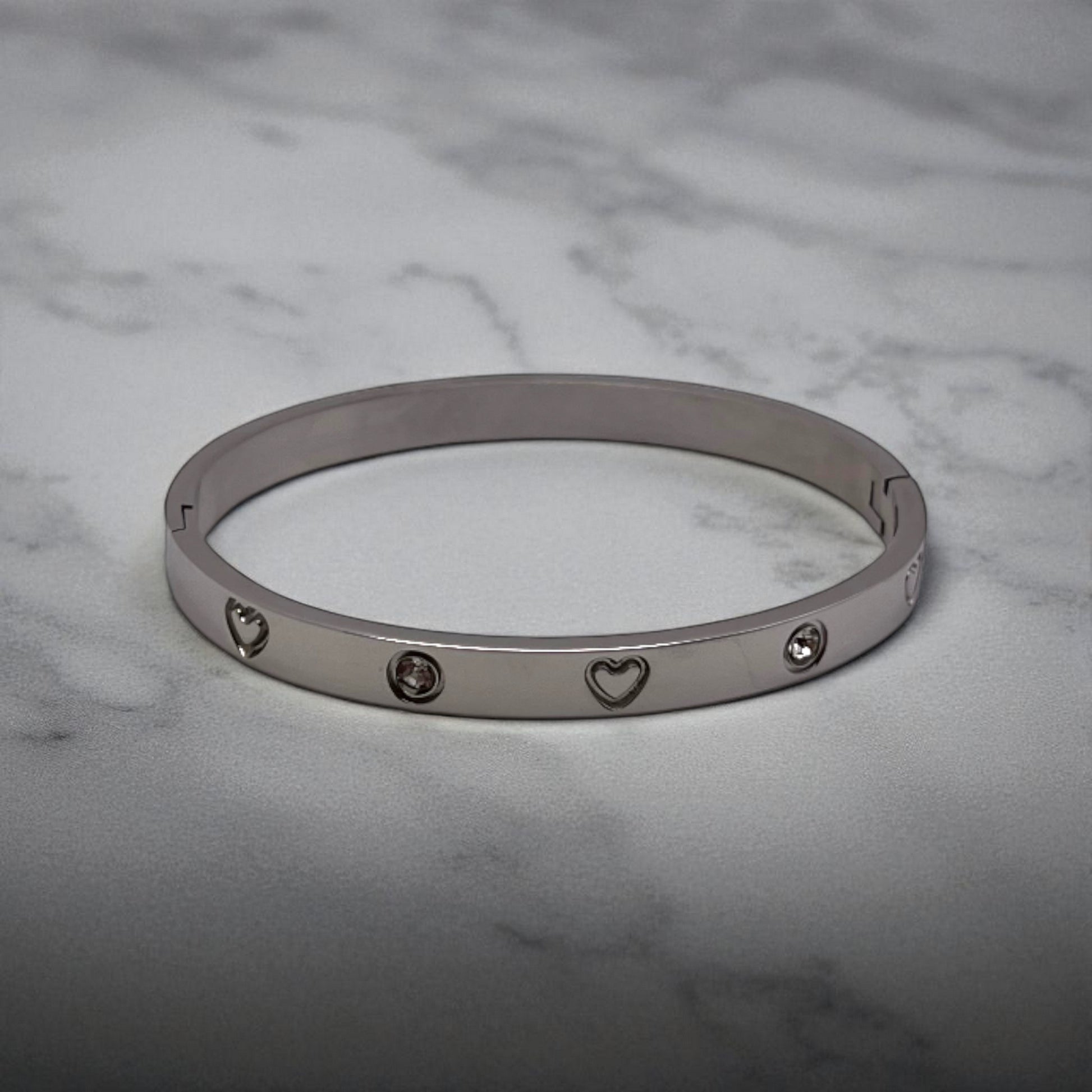 The Straight Diamonds & Hearts Bracelet, a refined accessory featuring a sleek linear design adorned with scattered diamonds and delicate heart motifs (silver version). This bracelet captures timeless sophistication, making it perfect for both everyday wear and special occasions, adding a subtle yet striking touch to your ensemble.